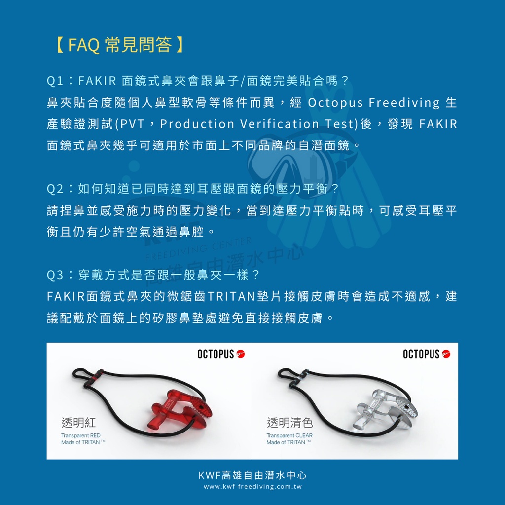 1. 如果此鼻夾使用不當,可能會導致嚴重的身體傷害,尤其是影響耳膜(穿孔)或眼睛(面罩擠壓);FAKIR適用於擁有充足耳壓平衡技巧的自由潛水員。