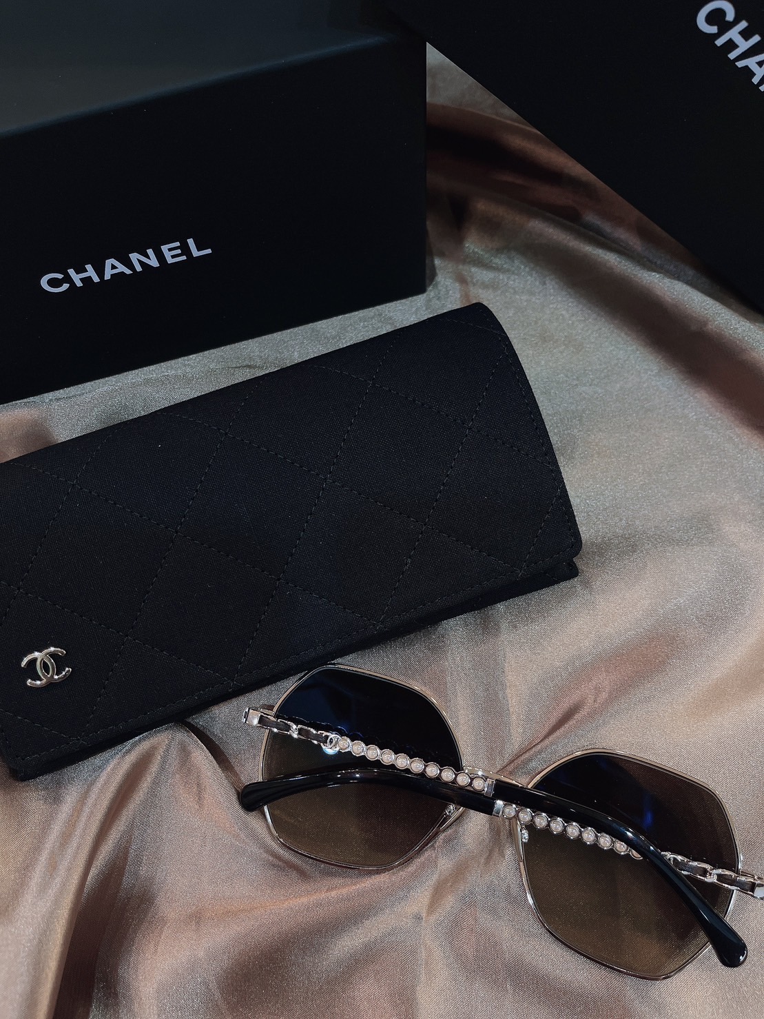 配上珍珠+雙C logo+皮穿鏈鏡腳