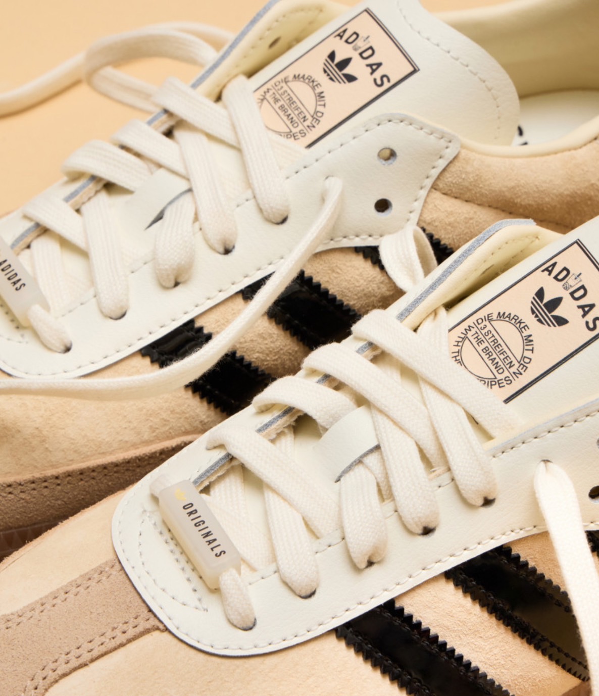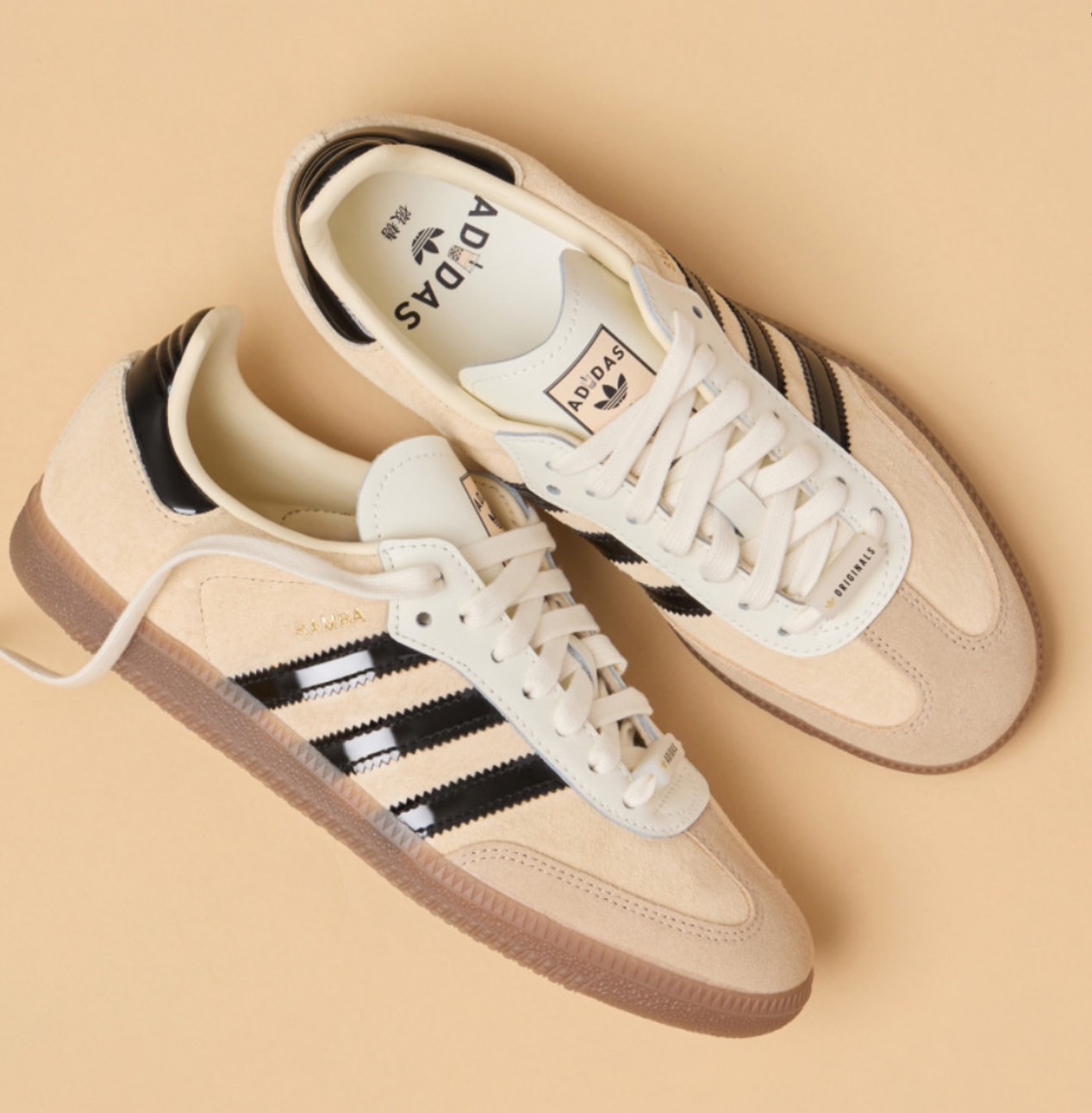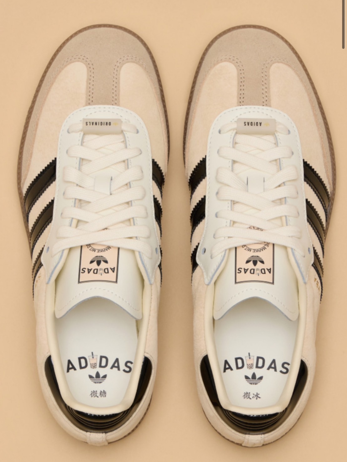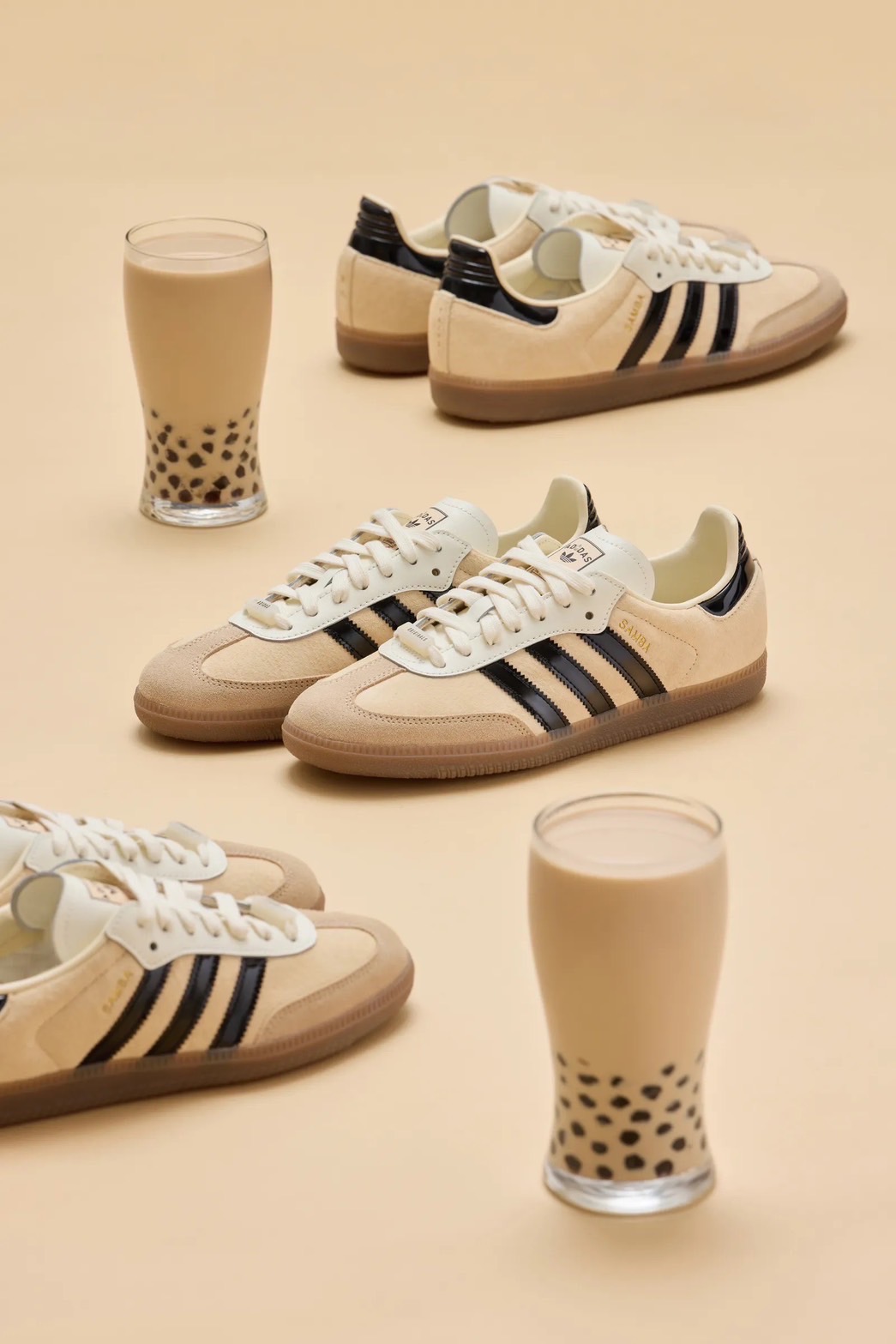 adidas Samba OG 鞋款以經典設計融合珍珠奶茶配色,米色鞋身與黑色三條紋,呈現簡約百搭風格。鞋舌與鞋墊印有經典三葉草 logo及珍珠奶茶圖樣,後跟加入「台北」字樣設計,增添在地特色及收藏價值
