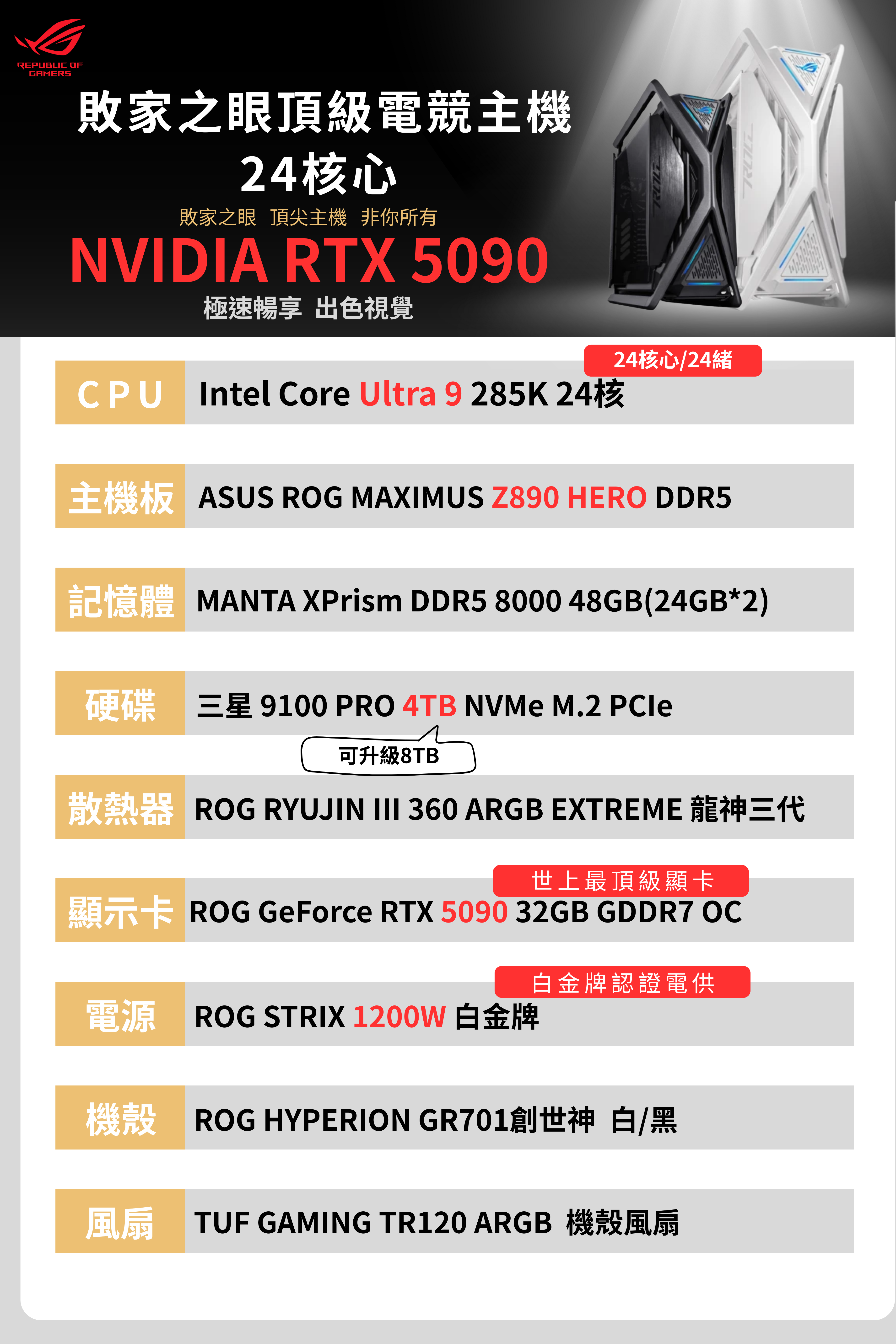 【 ROG敗家之眼頂級電競主機 】 ULTRA 9-24核15代 / RTX 5090 / 48G DDR5 / 4TB Gen5 SSD/1200W/ROG創世神