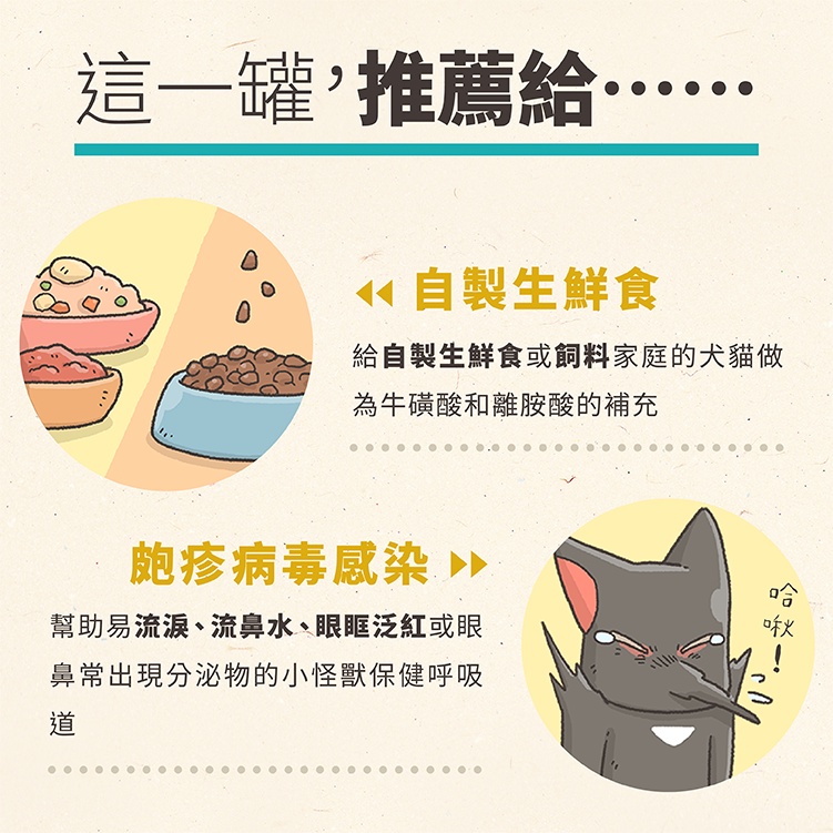 💡 適合五個月以上的犬貓,每周食用1-3次,頻率及用量可依需求調整。 初次食用及腸胃較敏感犬貓建議先從少量給予。