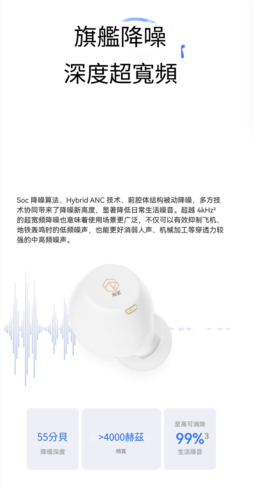 Soc 降噪算法、Hybrid ANC 技术、前腔体结构被动降噪,多方技 术协同带来了降噪新高度,显著降低日常生活噪音。超越4kHz² 的超宽频降噪也意味着使用场景更广泛,不仅可以有效抑制飞机、 地铁轰鸣时的低频噪声,也能更好消弱人声、机械加工等穿透力较 强的中高频噪声。