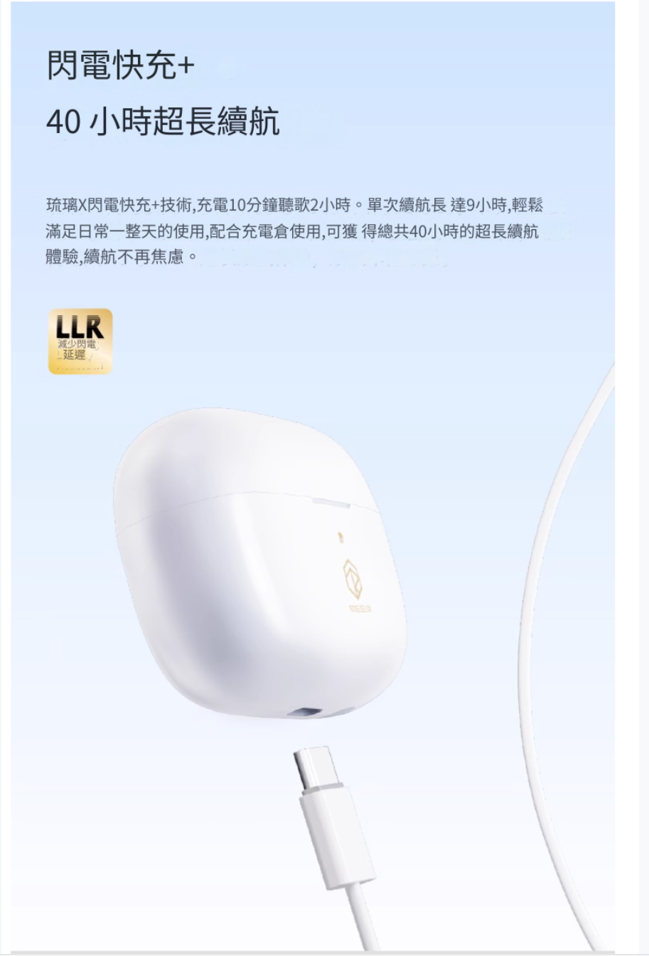 琉璃X閃電快充+技術,充電10分鐘聽歌2小時。單次續航長達9小時,輕鬆 滿足日常一整天的使用,配合充電倉使用,可獲得總共40小時的超長續航 體驗,續航不再焦慮。