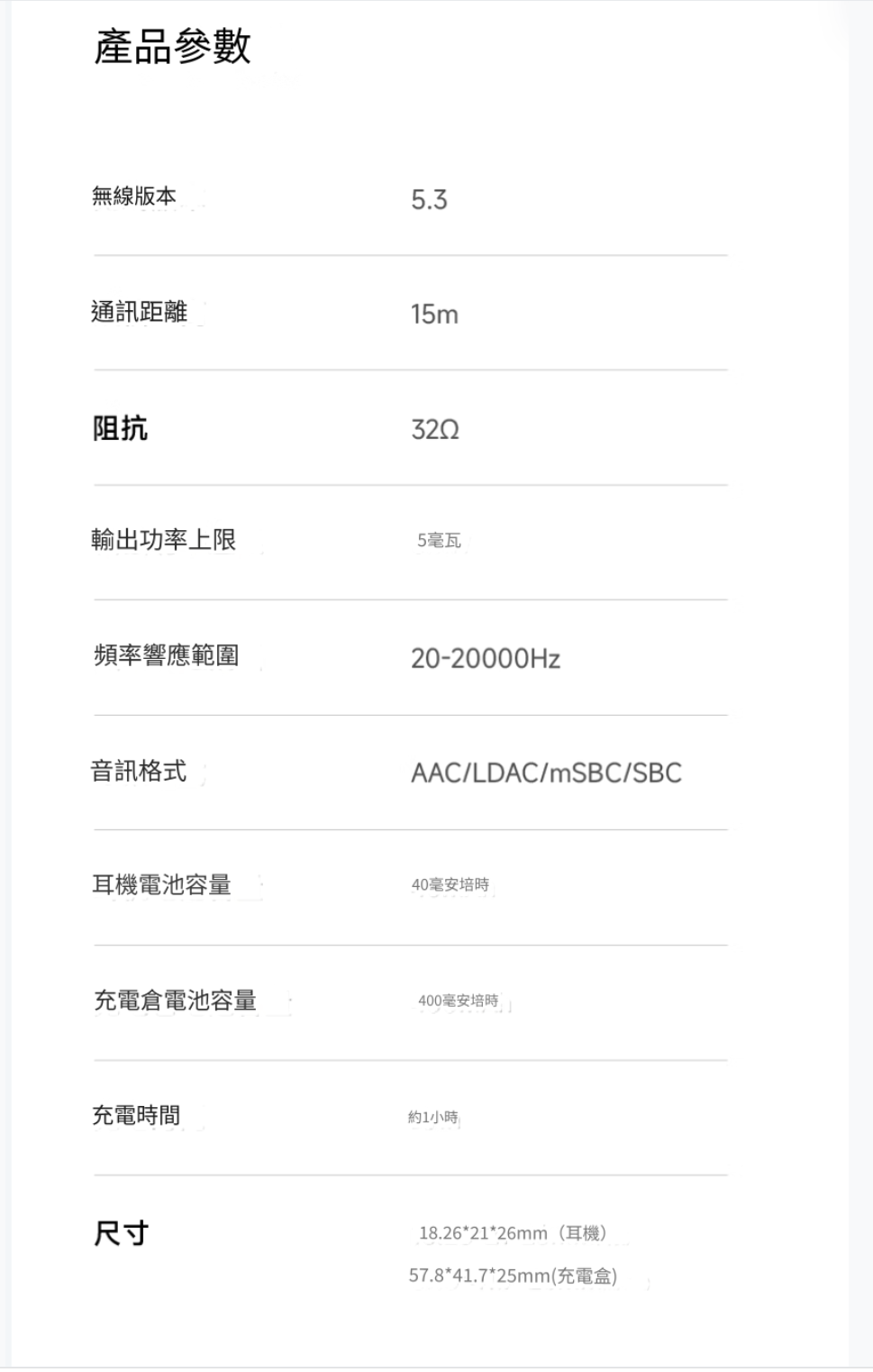尺寸18.26*21*26mm(耳機)/57.8*41.7*25mm(充電盒)