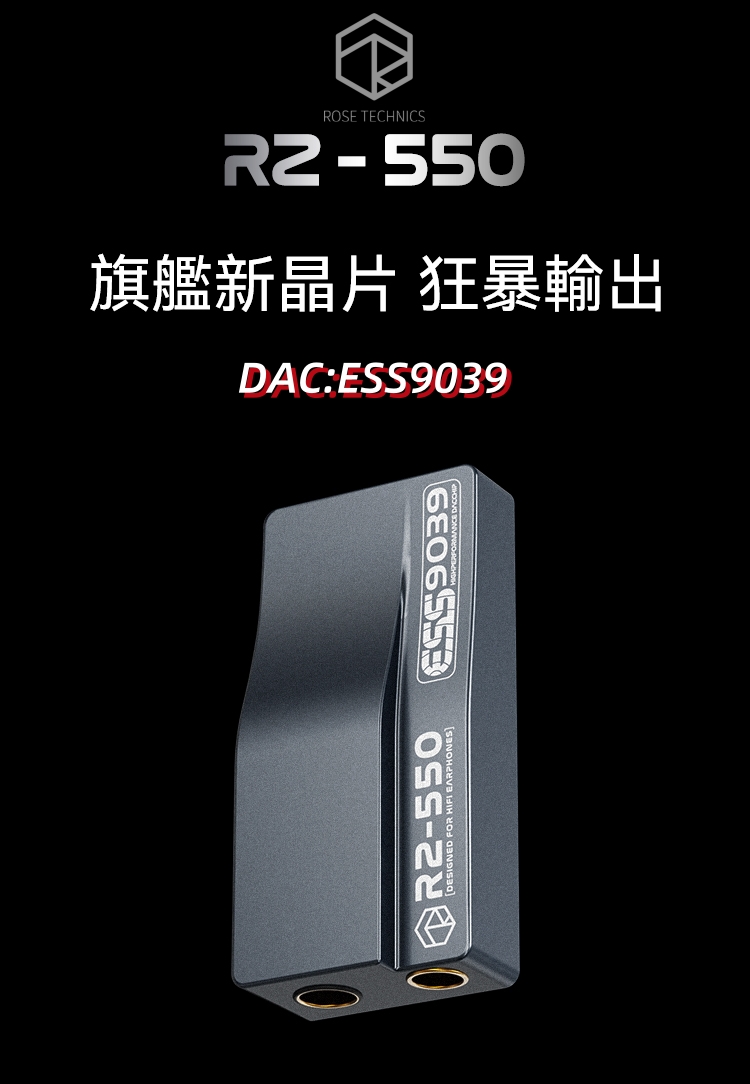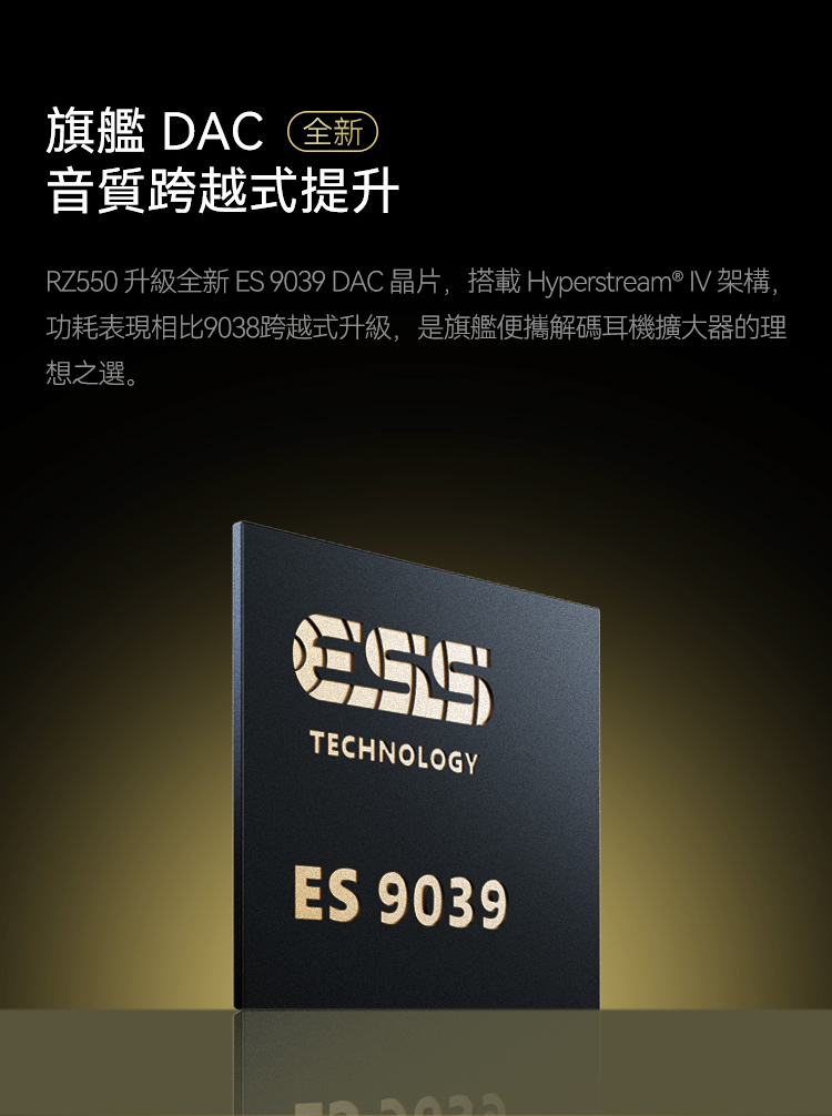 RZ550 升級全新 ES9039 DAC 晶片,搭載 Hyperstream(R標)IV 架構,功耗表現相比9038跨越式升級,是旗艦便攜解碼耳機擴大器的理想之選。