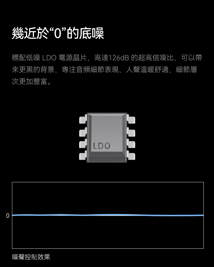 標配低噪LDO電源晶片,高達126dB的超高信噪比,可以帶來更黑的背景,專注音頻細節表現,人聲溫暖舒適,細節層次更加豐富。