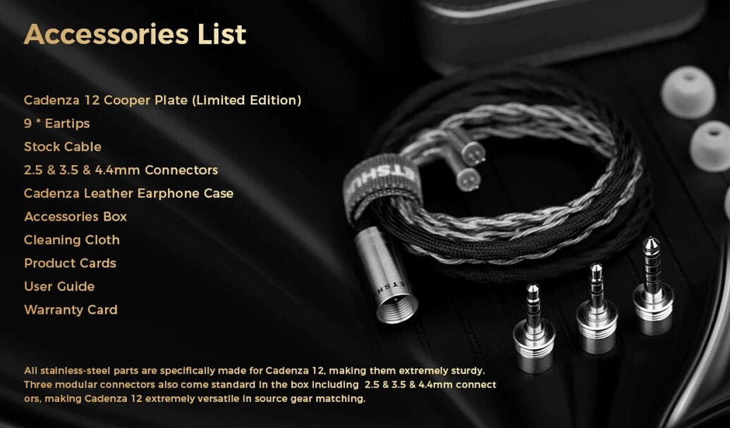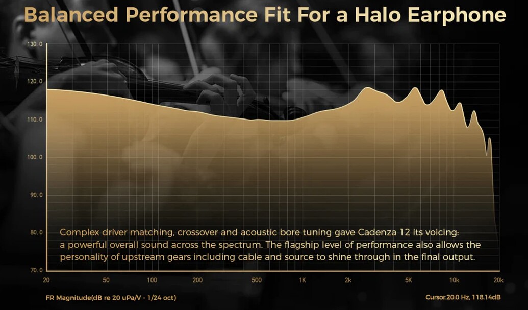 Cadenza 12採用優質鈦合金材料設計。 外殼採用高精度五軸cnc加工工藝製成,具有鈦材料的藝術外觀、卓越的工藝和卓越的聲音特性。