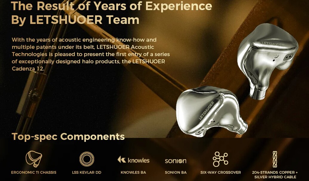 LETSHUOER Cadenza 12 是LETSHUOER最新的旗艦入耳式耳機,採用 12 單體混合配置。華彩 (音樂術語) 音樂術語,原指意大利正歌劇中詠歎調末尾處由獨唱者即興發揮的段落。後來在協奏曲樂章的末尾處也常用此種段落,樂隊通常暫停演奏,由獨奏者充分發揮其表演技巧和樂器性能。以達到昇華作品的作用。。 LETSHUOER 汲取了這一靈感,設計了這款終極旗艦入耳式耳機,結合了 10 毫米定制矽膠振膜動圈和每側 11 個高性能動鐵。 專業的調音調節,精準的五路實體電子分頻,讓樂Cadenza 12帶來非凡的音響表現!