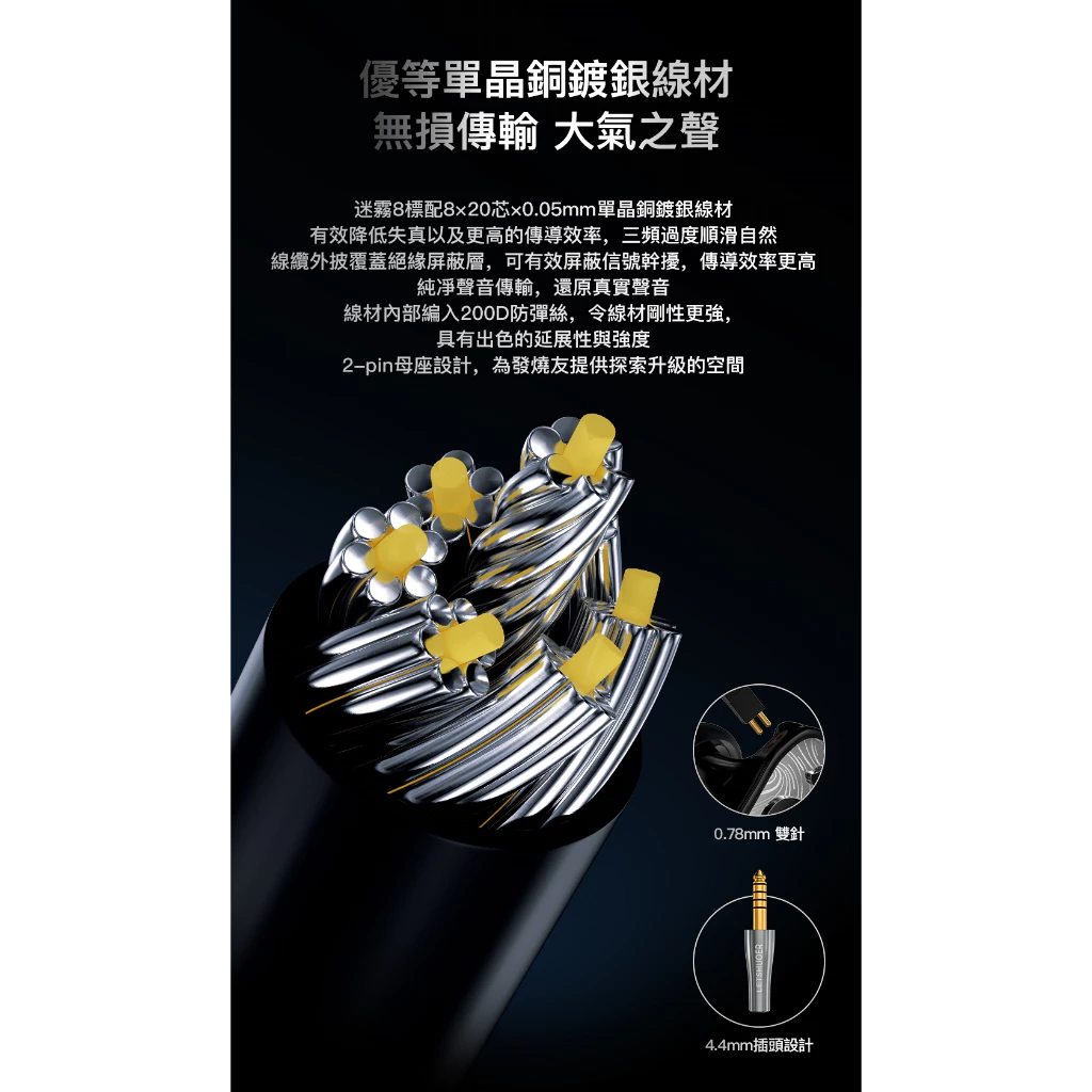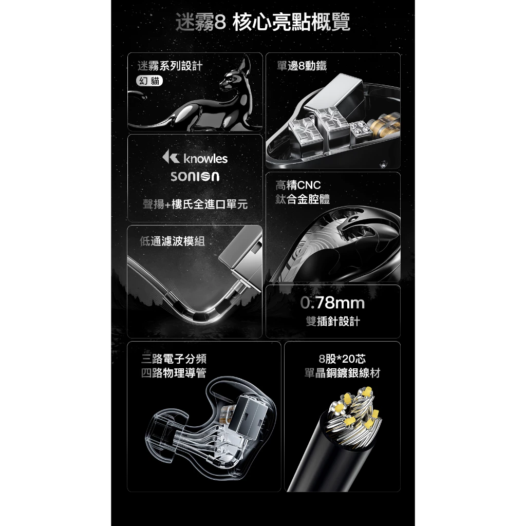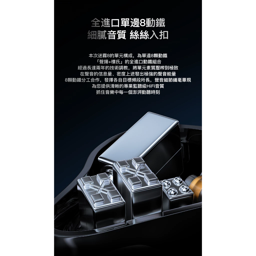 本次迷霧8的單元構成,為單邊8顆動鐵 「聲揚+樓氏」的全進口動鐵組合經過長達兩年的技術調教,將單元素質壓榨到極致在聲音的信息量、密度上进發出極強的聲音能量 8顆動鐵分工合作,發揮各自目標頻段所長,聲音細節纖毫畢現為您提供清晰的專業監聽級HiFi音質抓住音樂中每一個澎湃動聽時刻