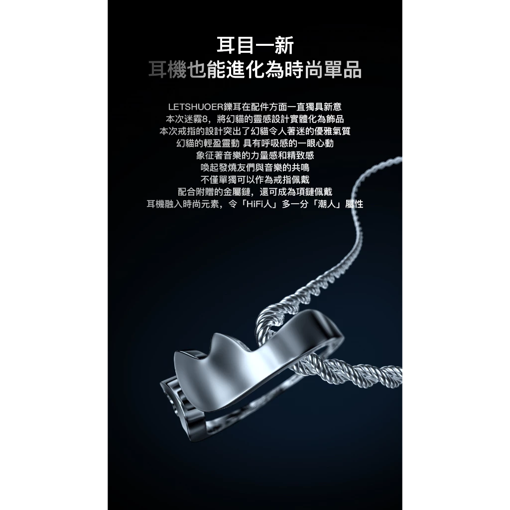 迷霧8作為LETSHUOER鑠耳「迷霧」系列的首個作品靈感本意為,優秀的產品所帶來的出色音質終會沖破當下冗雜的HiFi市場,被大眾所聽到所以我們給「聲音」設計了一個載體便是本次迷霧8的主角——幻貓