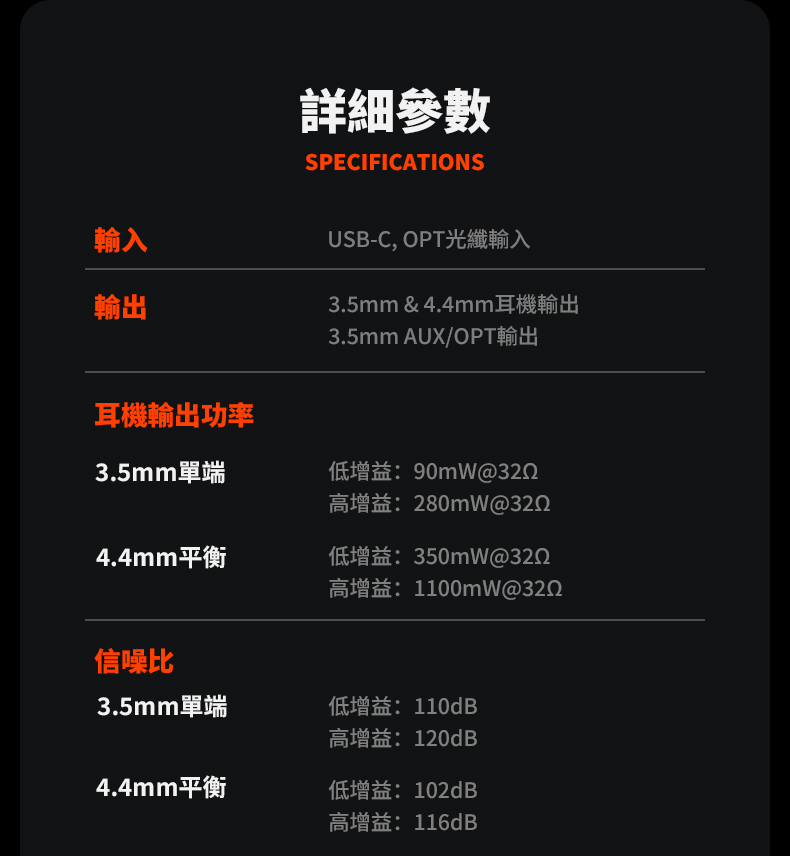 輸出:3.5mm 耳機、4.4mm 耳機、3.5MM 線路輸出/OPT