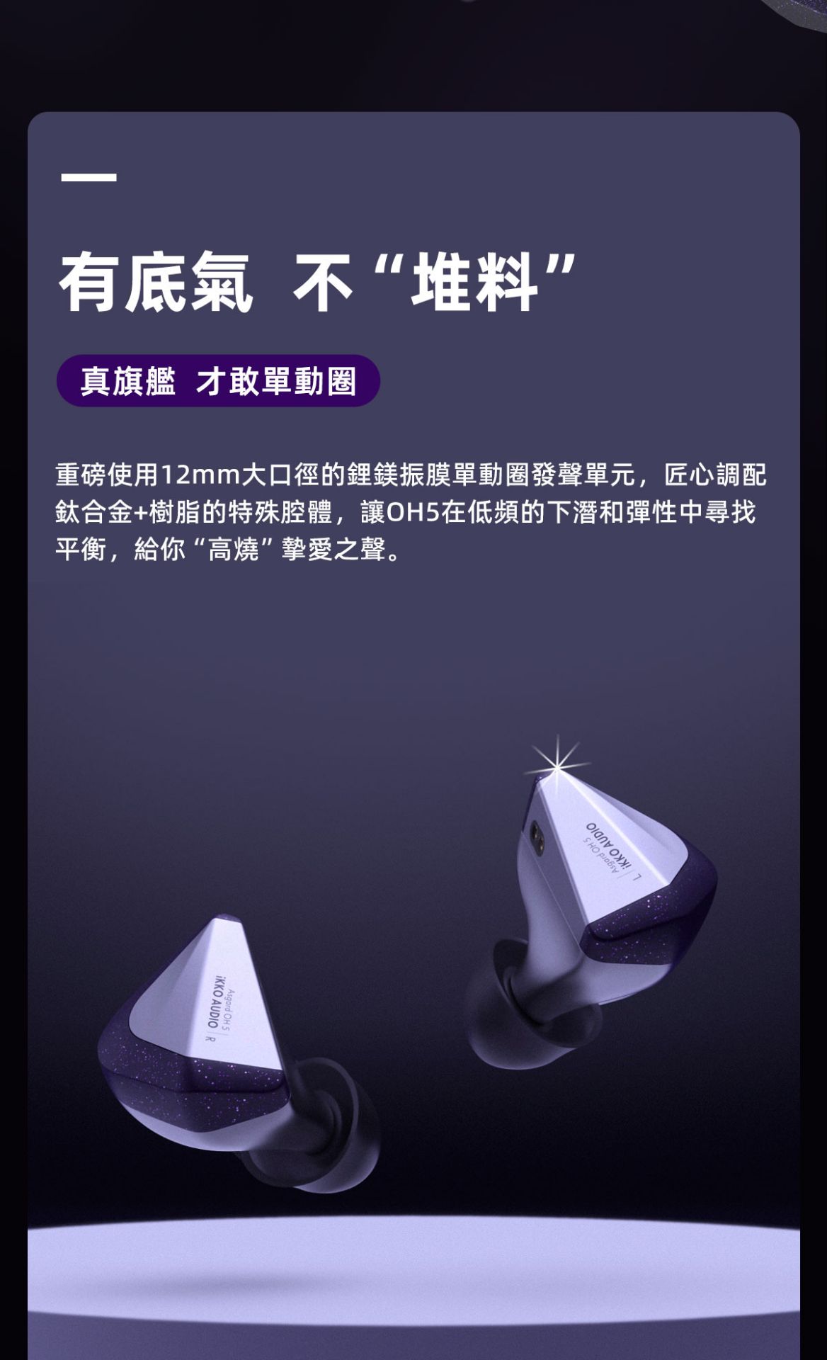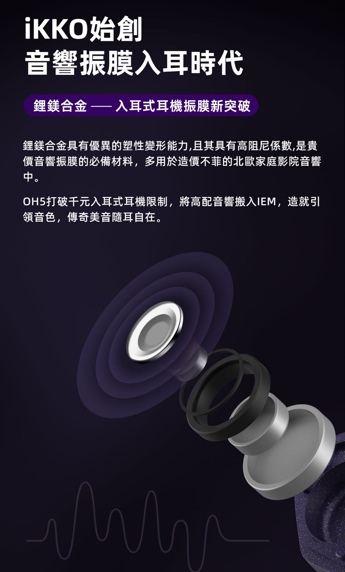 鋰鎂振膜通常用於頂級家庭音響系統。 與傳統鈹振膜耳機相比,OH5音色完美,鋰鎂振膜安全無毒,可回收利用。 iKKO是世界上第一個將鋰鎂振膜集成到耳機中的品牌。