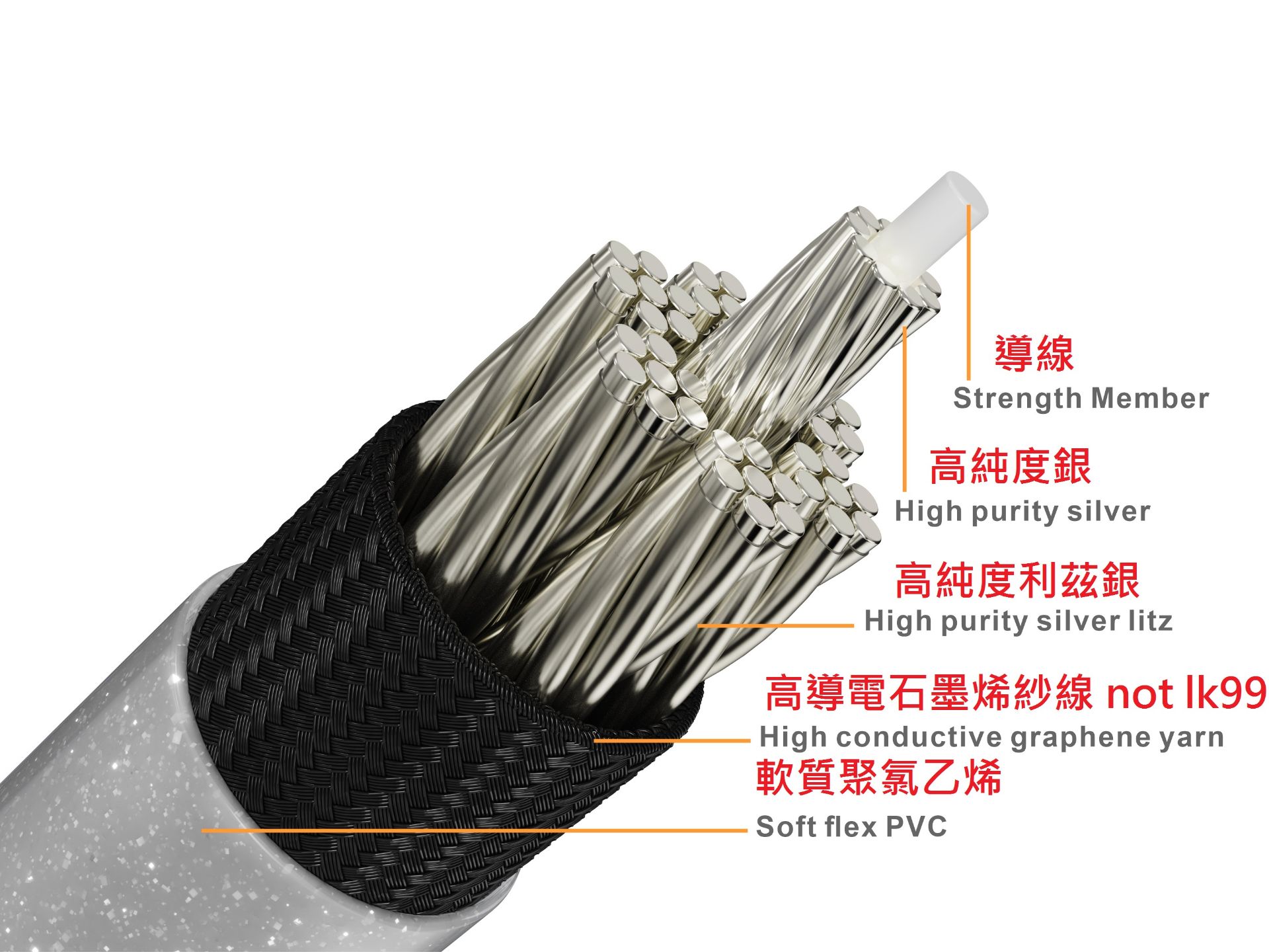 2. 音場的表現亦佳:純銀的高導電性及低雜訊讓聲音擁有更寬廣的音場表現,再透過高導電石墨烯編織屏蔽層的助力,較其他同質的升級線擁有更寧靜的背景與開闊的空間感,讓樂曲更加貼近真實的音場效果。