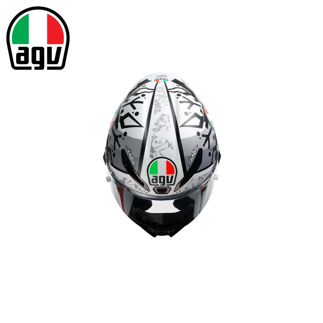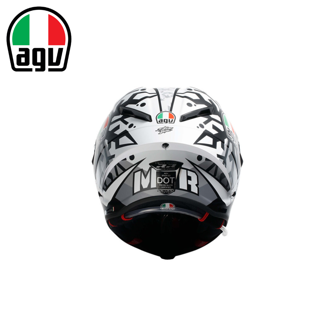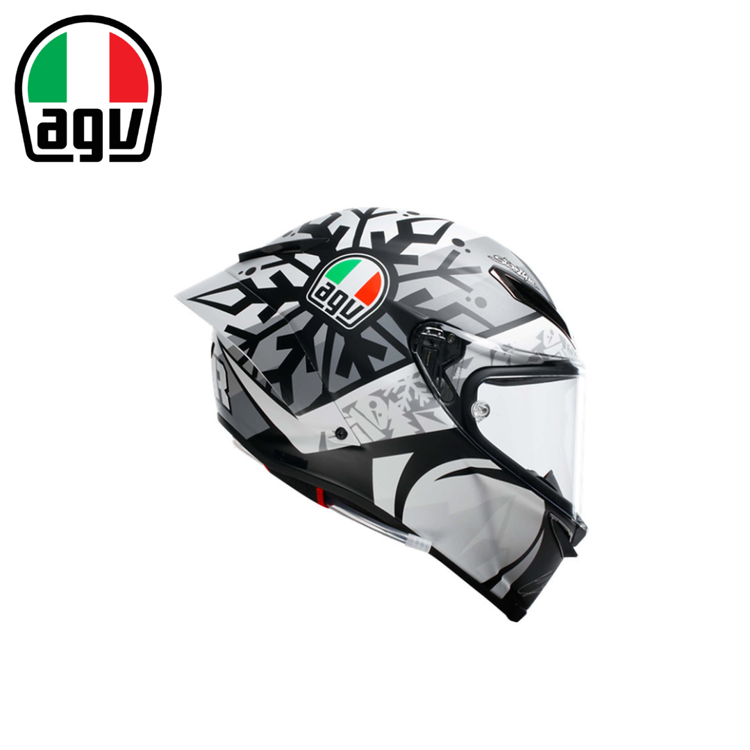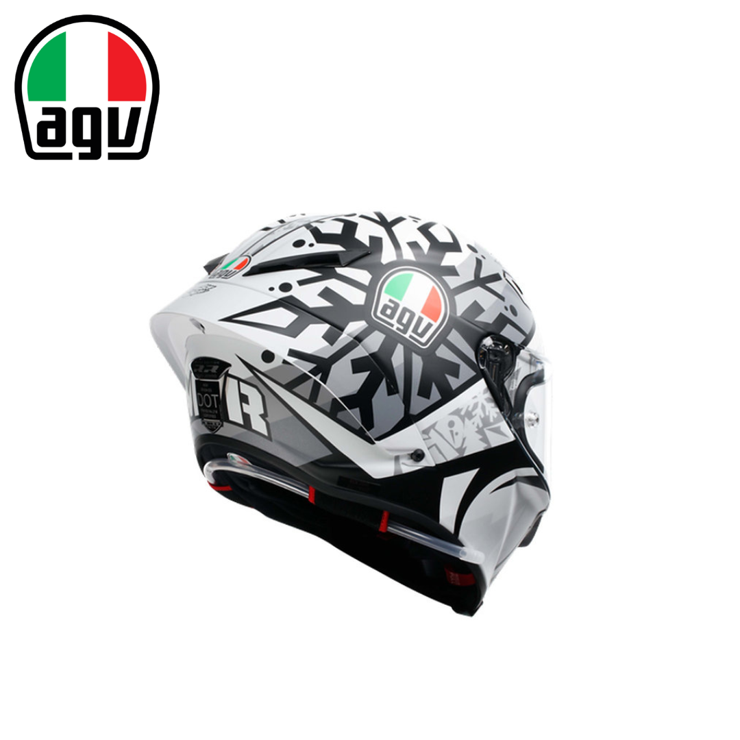 2020年 MotoGP 世界冠軍 - Joan Mir 此款彩繪是 Mir 與 AGV 粉絲一同在網路設計的2021冬季測試帽。 運用雪花圖騰搭配Mir招牌閃電圖示,並以灰階色彩來呈現冬季測試的涵義, 背後是2020 MotoGP™ 冠軍 "M1R"專屬標誌,是款獨特且細緻的紀念帽款。
