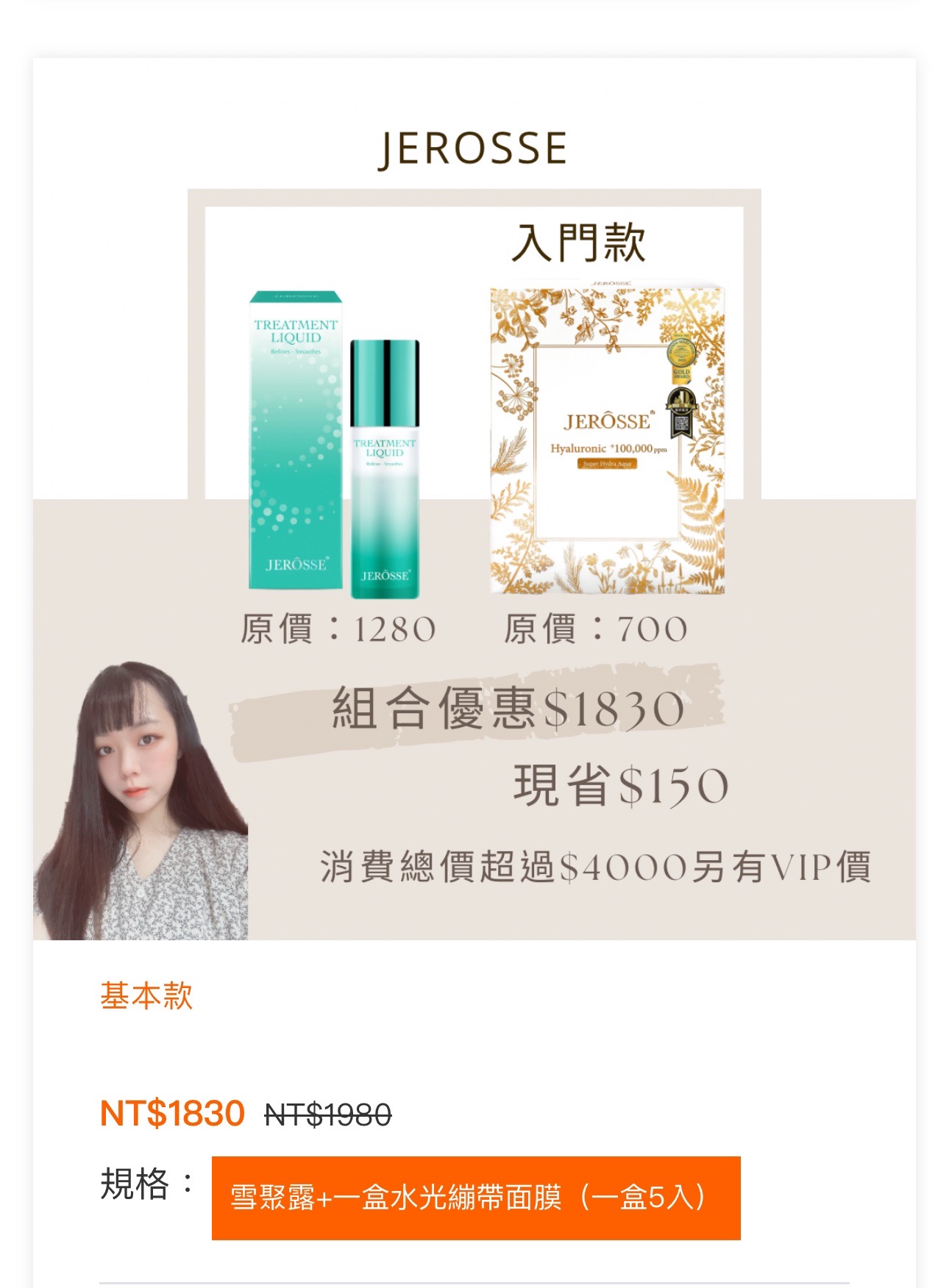 JEROSSE入门款原價:1280原價:700組合優惠$1830現省$150消費總價超過$4000另有VIP價基本款NT$1830 规格:雪聚露+一盒水光繃帶面膜(一盒5入)