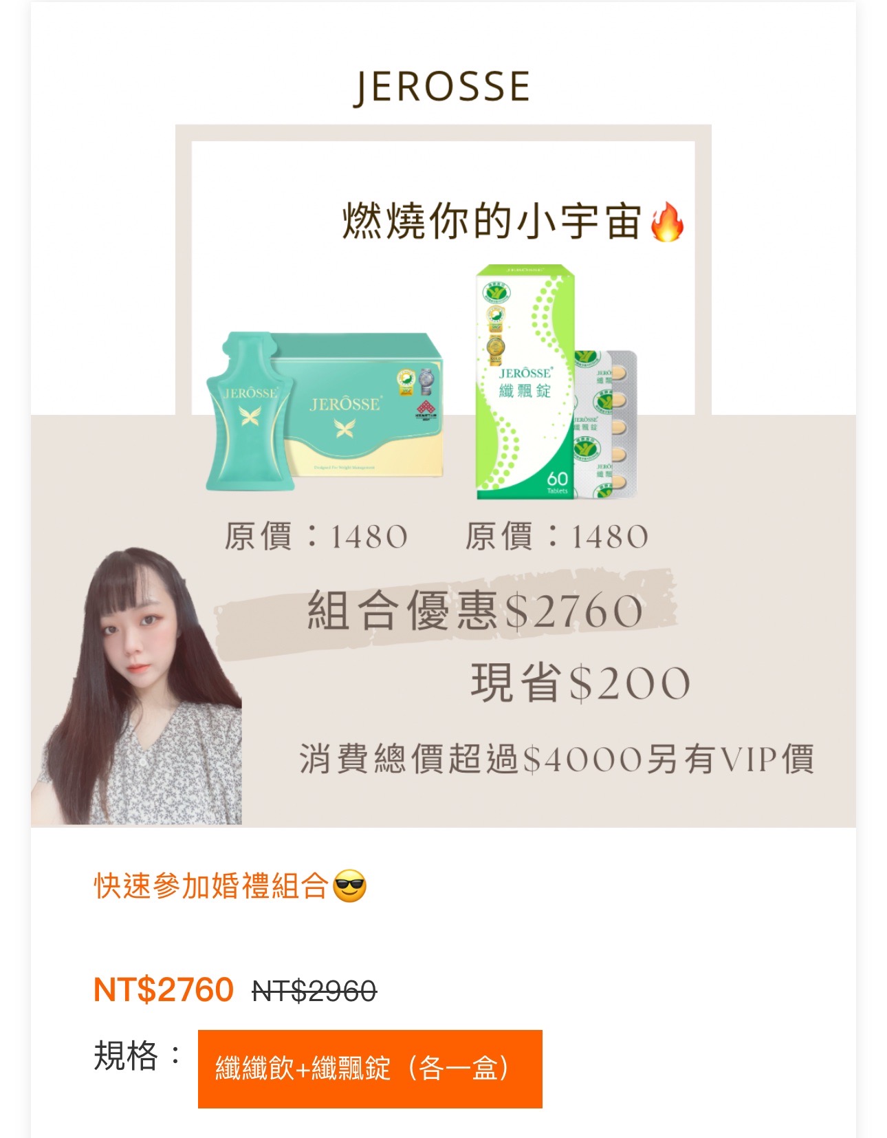 JEROSSE燃燒你的小宇宙纖飄錠原價:1480 原價:1480組合優惠$2760現省S200消費總價超過$4000另有VIP價快速參加婚禮組合规格:纖纖飲+纖飄錠(各一盒)
