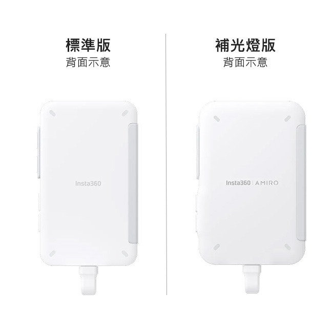 讓用戶便於使用手機較佳品質的後置鏡頭預覽及拍攝。 3.5 吋高畫質觸控螢幕,構圖精準順手。 即插即用,無需充電。 低延遲預覽,帶來真正的「所見即所得」體驗。 專屬保護皮套設計,收納安心,輕薄便攜。 支援多款第三方美顏攝影與社群媒體APP 補光燈版與美容科技專家 AMIRO 共同研發,提供3種色溫和5種亮度等級。 Insta360 Snap 有標準版及補光燈版2種版本,規格及功能略有差異,詳見本頁內文介紹。 本產品不含手機和其餘配件。