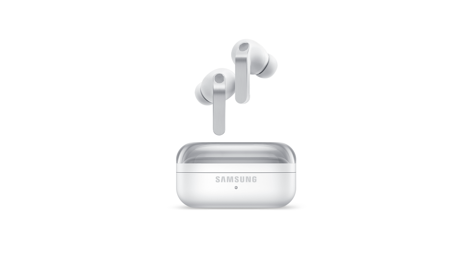 一對極光白 Galaxy Buds4 Pro 圍繞兩部 Galaxy 智慧型手機。其中一部手機露出背面。另一部手機顯示一個人戴著極光白 Galaxy Buds4 Pro。