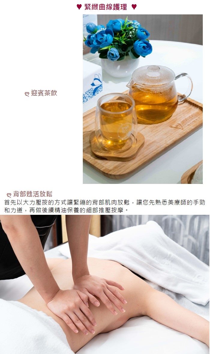 緊緻曲線護理:迎賓茶飲→水潤芳香沐浴→背部甦活放鬆→背部活氧律動精油按摩→上焦擀筋棒深層鬆筋疏通→頭抗氣循舒刮按摩→美腿魔力緊緻曲線搭配擀筋棒疏通→腹部淨化循環按摩→腹宮薑膜暖敷蠻腰定型膜智慧曲線→頭肩頸精油放鬆按摩
