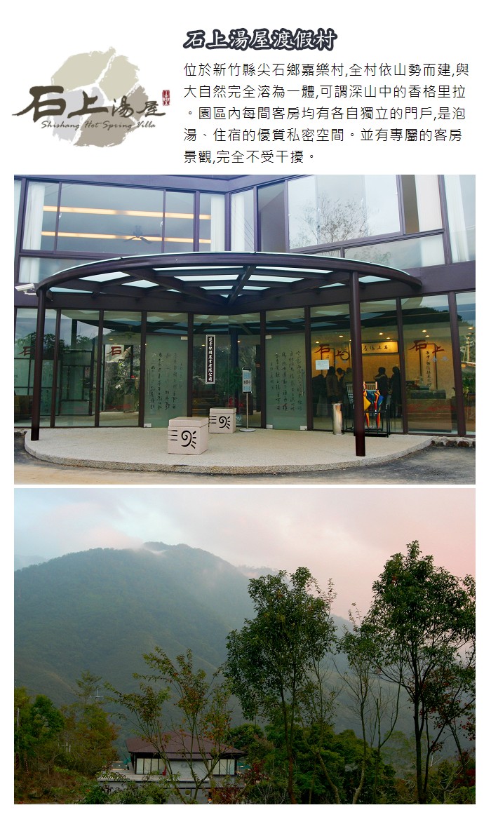 『空山新雨後,天氣晚來秋,明月杉間照,清泉石上流』是石上湯屋的寫照,它擁有青山翠谷,原湯原味,結合大自然與溫泉,創造一個健康養生,寧靜休閒的全方位泡湯空間,專為重視生活品味及科技新貴的消費者量身訂做。