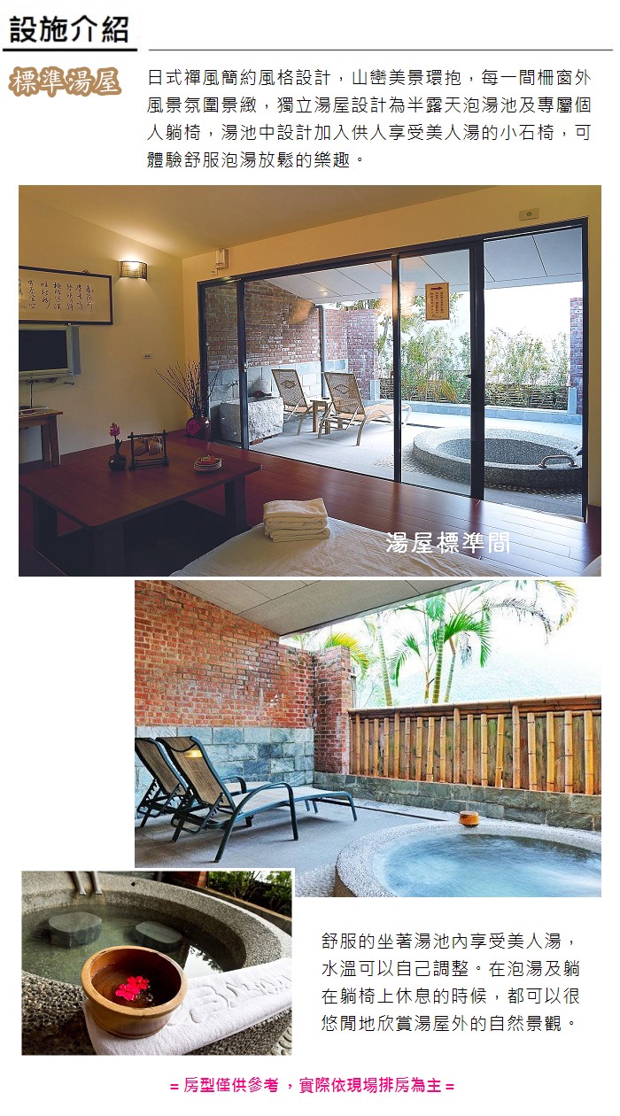 1.本券可雙人住宿石上湯屋標準湯屋一晚(恕不指定房型),含2客早餐、2客風味套餐。