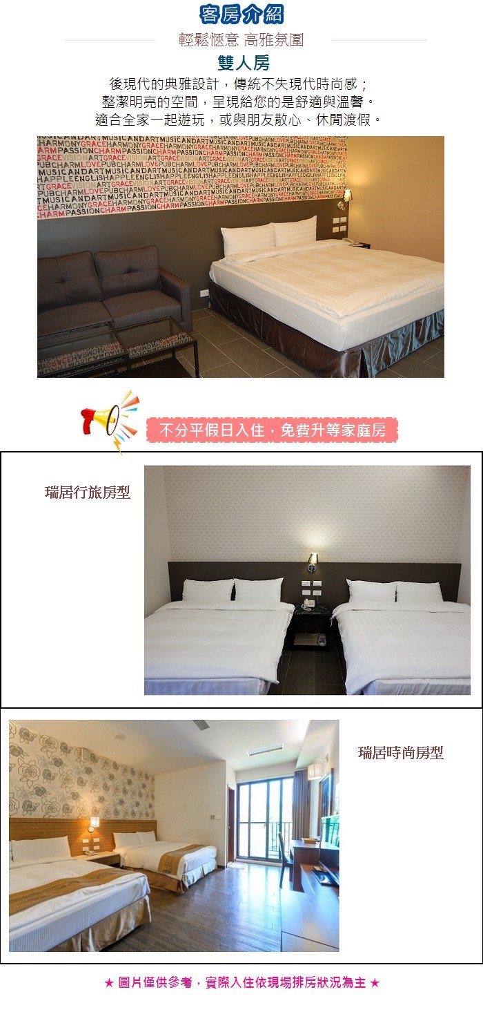 1.單張可2人於瑞居渡假飯店入住雙人房乙晚,含早餐2客、晚餐2客。