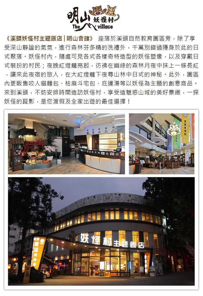 可2人至妖怪村明山別舘入住《2人房》乙晚,含早餐。※房型依現場排房為準,恕不得指定。
