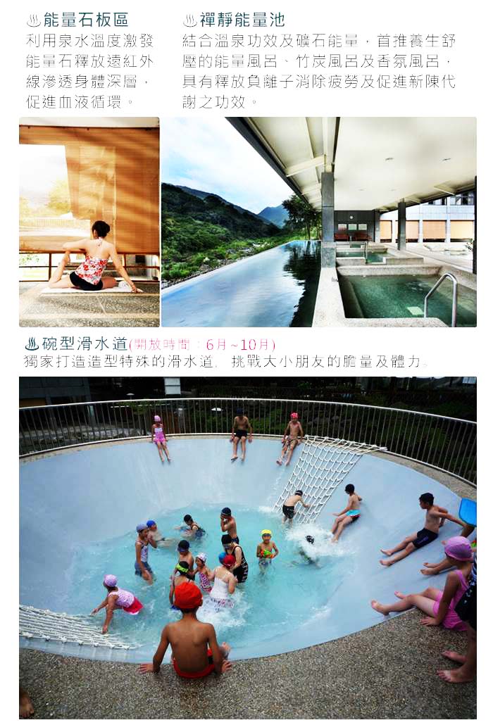 設施:戶外高低溫泉池、男女裸湯、禪靜能量區、禪靜能量池、碗型滑水道、負離子水簾、冷泉親水區、塞納河畔沙灘、烤箱、蒸氣室。