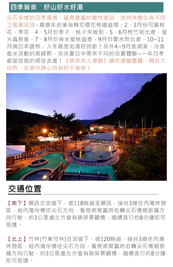 《錦屏美人湯館》位於新竹尖石鄉油羅溪畔原住民小錦屏村,園區佔地約15000平方公尺,提供優質休閒旅遊品質,結合原住民特色、淳樸高雅溫泉景觀,鄰近薰衣草森林、綠世界、鎮西堡、司馬庫斯、內灣休憩區、北埔老街等景點,是全家出遊或公司教育訓練的最佳選擇!由台灣中油公司團隊探勘,在地底深達1530公尺處,開挖出質量俱佳、純淨無污染的泉脈。在嚴格檢測認證下,確認為無色無味頂級的碳酸氫鈉鹽泉,無論水量、水溫、水質均屬台灣頂級溫泉。因其碳酸氫根離子含量超高,「美人湯」名當之無愧!
