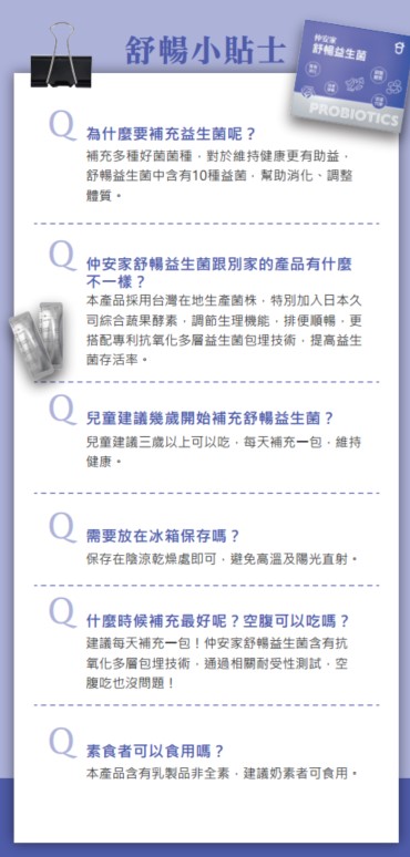 舒暢益生菌:建議每天一包,含有抗氧化多層包埋技術,空腹吃也沒問題!
