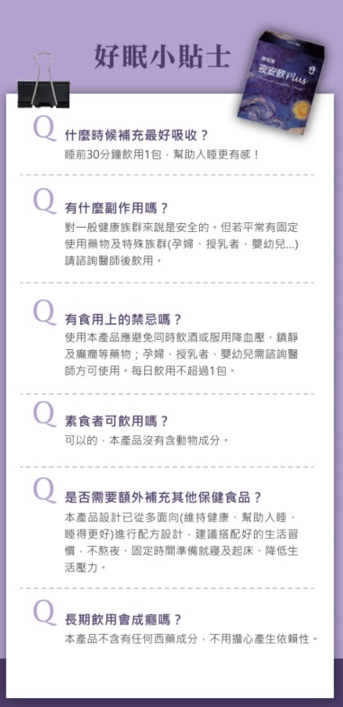 夜安飲Plus:不含任何西藥成份,不用擔心產生依賴性,睡前30分鐘1包,幫助入睡更有感。