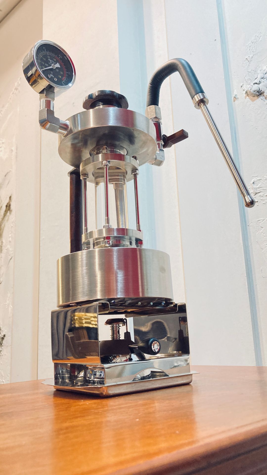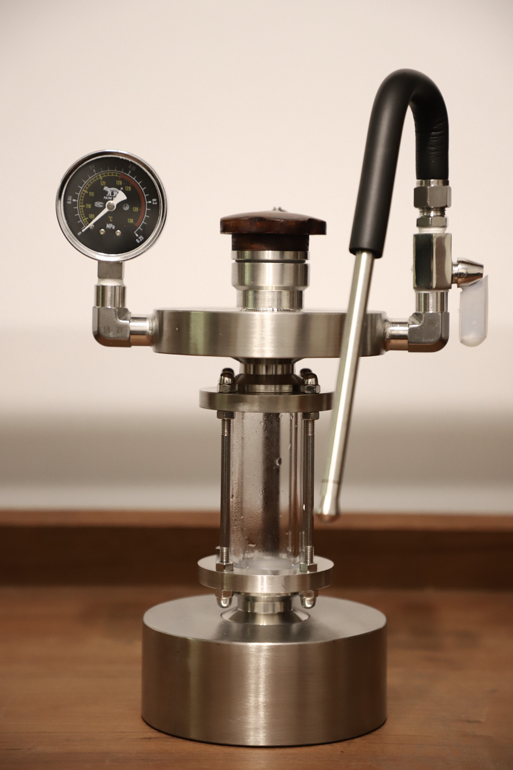 整台機器一樣是採用304不鏽鋼打造,手柄實木防燙隔熱,底部水倉直徑約14cm,大底部讓加熱速度提升,水倉整體可容納700ml的水量,中間採用可視化耐熱石英玻璃,耐溫一千多度,耐壓十多公斤,上層為蒸汽腔,可使蒸汽壓力高達2bar,而且“非常乾燥”。加熱方式可採用瓦斯爐加熱或是電磁爐,靈活運用。加特林裝有洩壓閥,壓力超過會自動洩壓,使用上更安全。每台機器都是手工打造打磨,沒有像市場上美輪美奐的外表,但是這樣的用料跟工藝絕對是一台可以用到天荒地老的機器!