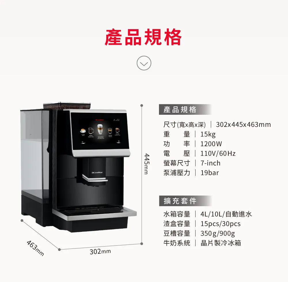 擁有大容量水箱及豆槽設計,簡易的大螢幕中文化操控及全自動管路清潔設計,