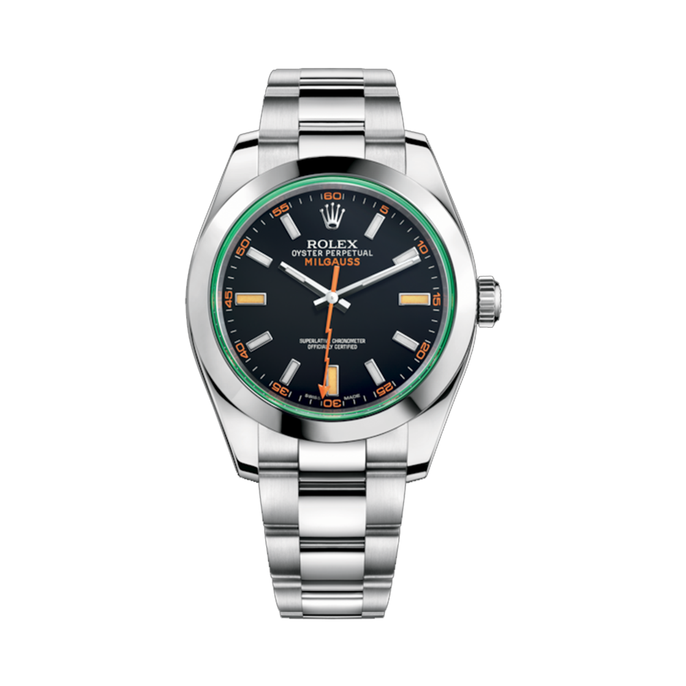 1956年勞力士推出Milgauss,在錶殼內加裝軟鐵內殼,能抵抗1,000高斯強度的磁場,而這款116400GV在Milgauss 50週年的隔年2007推出,仍被視為是呼應週年所推出的款式。鏡面採用綠色的藍寶石水晶玻璃,正面看不影響一般使用視讀、從側面看則是會透出明顯的綠色,因此被暱稱為綠玻璃。由於此為勞力士少數在錶款裡運用品牌色綠色的款式,加上閃電形狀的橘色秒針非常顯眼,特殊性高,錶款發布第一年因湧現大量需求爆出驚人的超訂行情。