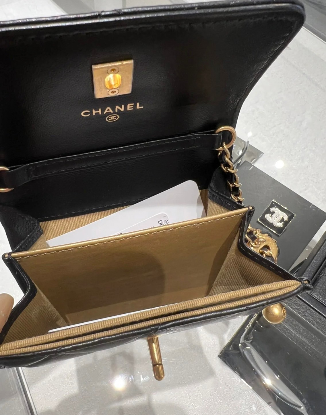 Chanel香奈兒 經典雙C LOGO菱格紋滑面小羊皮皮穿鏈可調節核桃金球斜背雙層卡包 黑色/金釦