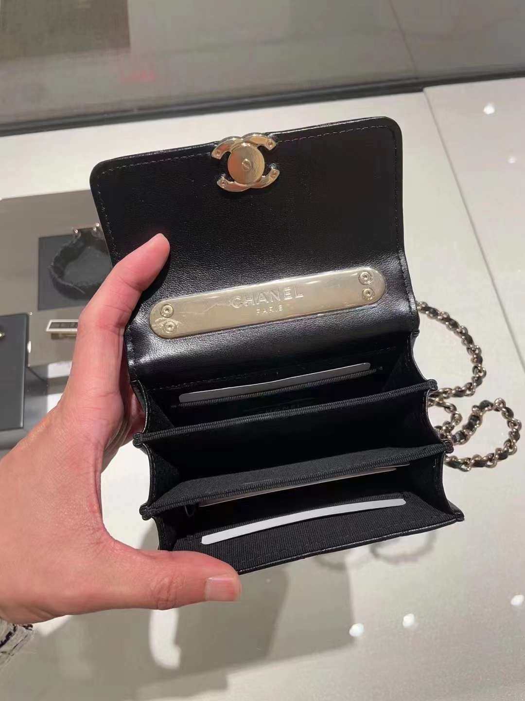 Chanel香奈兒 經典雙C LOGO菱格紋滑面小羊皮金屬手提/斜背風琴式多夾層斜背小廢包 黑色/金釦