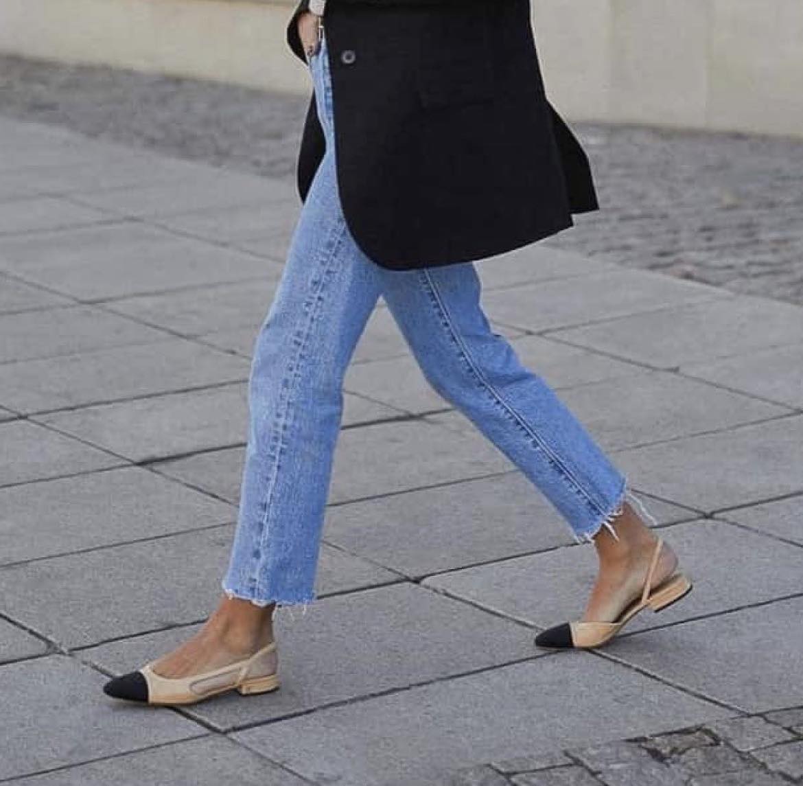 Chanel香奈兒 經典雙C Logo Slingback 後繫帶平底鞋 米黑色/38碼