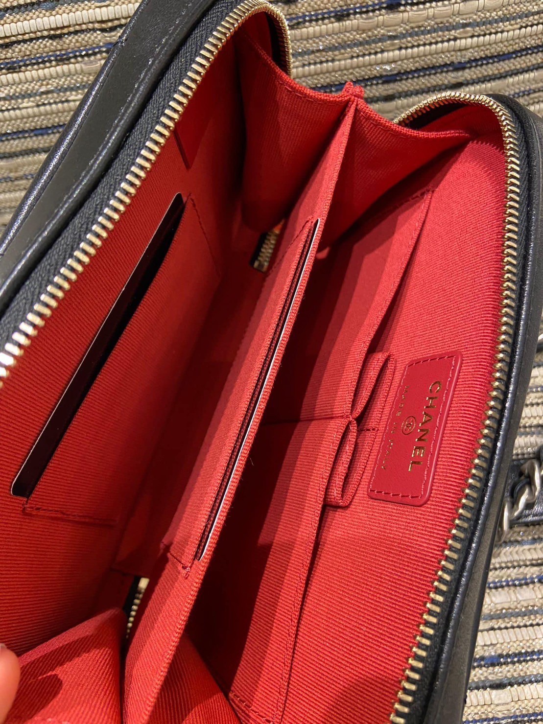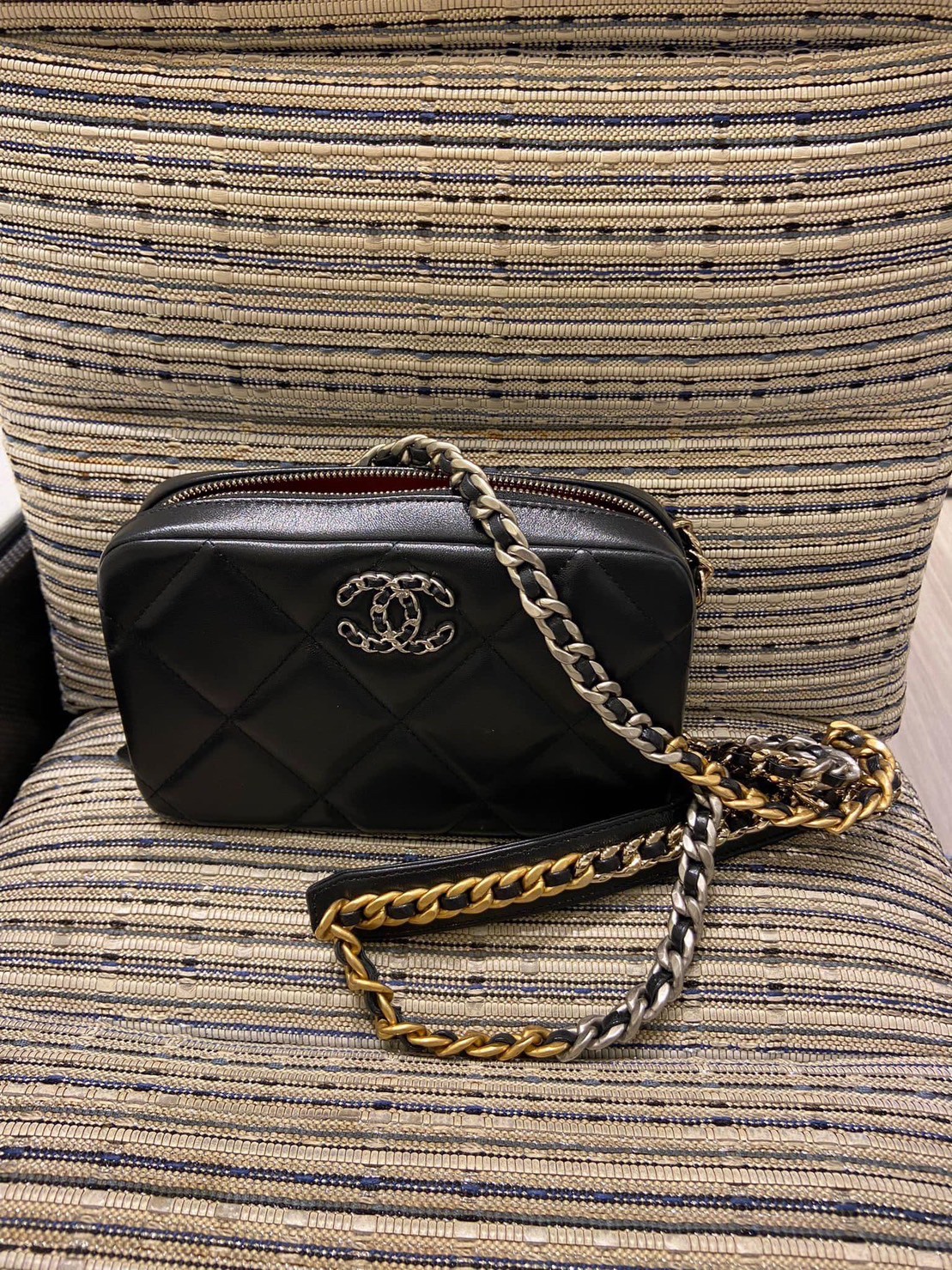 Chanel香奈兒 19系列經典金屬雙C LOGO菱格紋小羊皮WOC相機包/斜背包 黑色/金釦
