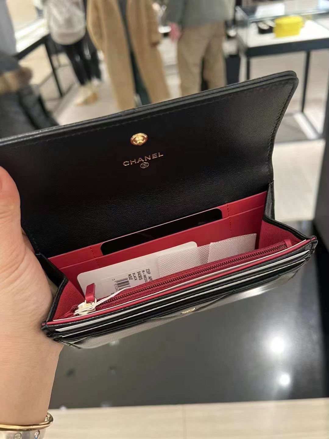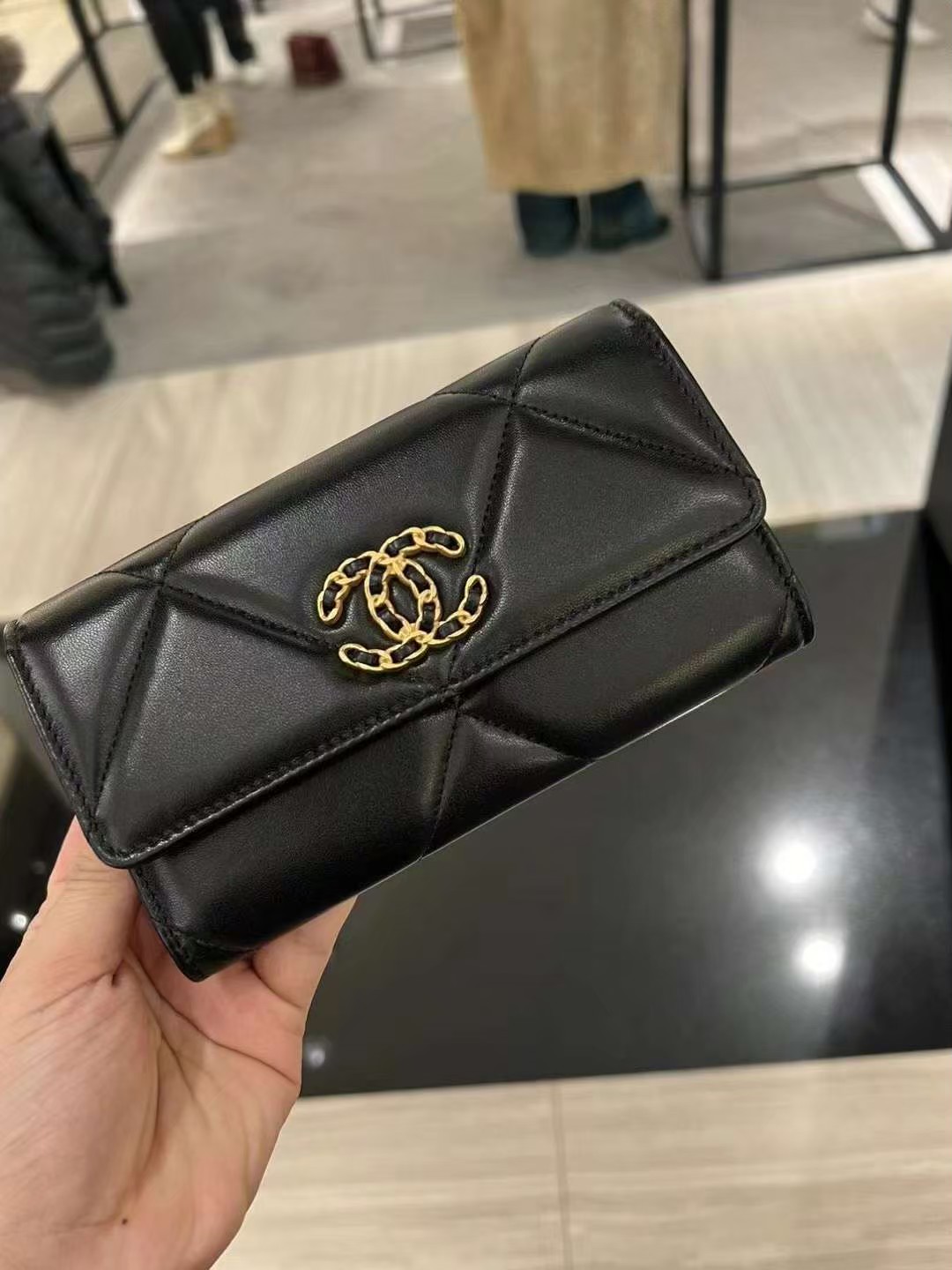 Chanel香奈兒 19系列經典金屬雙C LOGO菱格紋滑面小羊皮暗扣翻蓋中夾 黑色/金釦