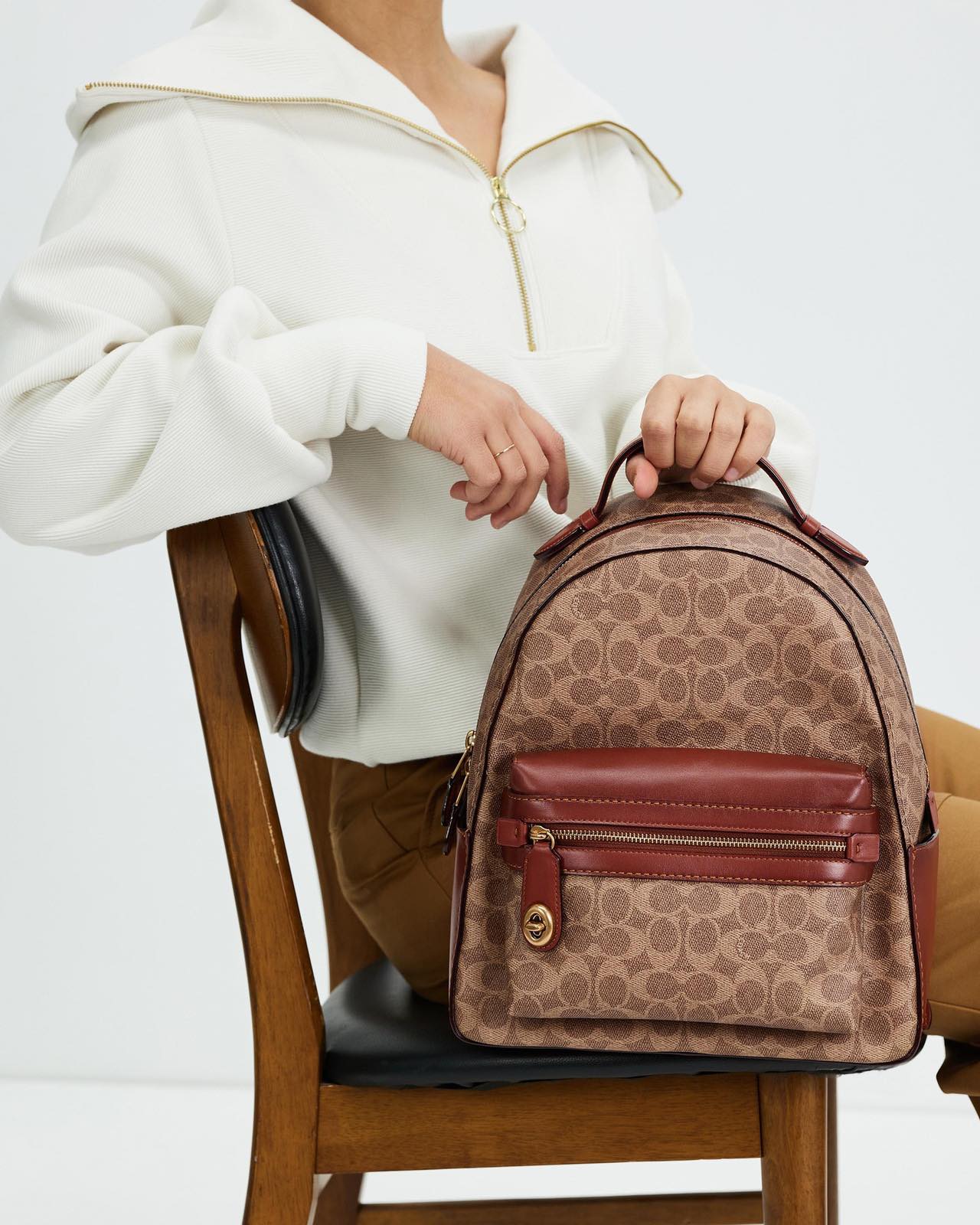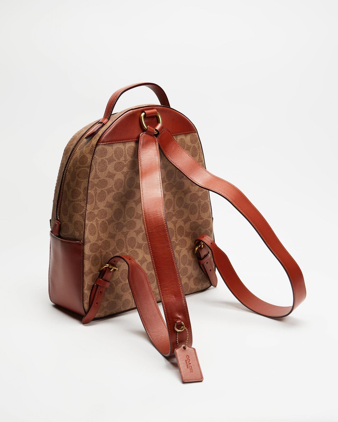 COACH Campus 經典馬車緹花Logo帆布皮革鑲邊 書包扣 雙肩後背包 棕色/大號 - 可放筆電/媽媽包