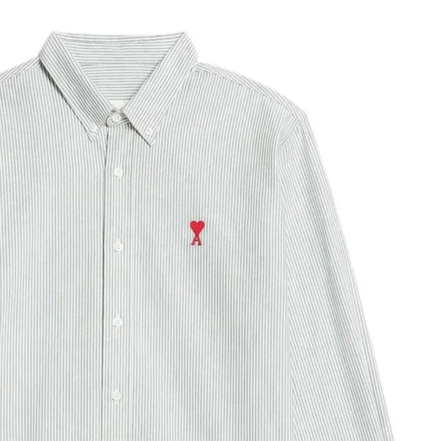 【AMI PARIS】經典紅愛心LOGO 淺綠 細條紋 棉質 長袖 襯衫