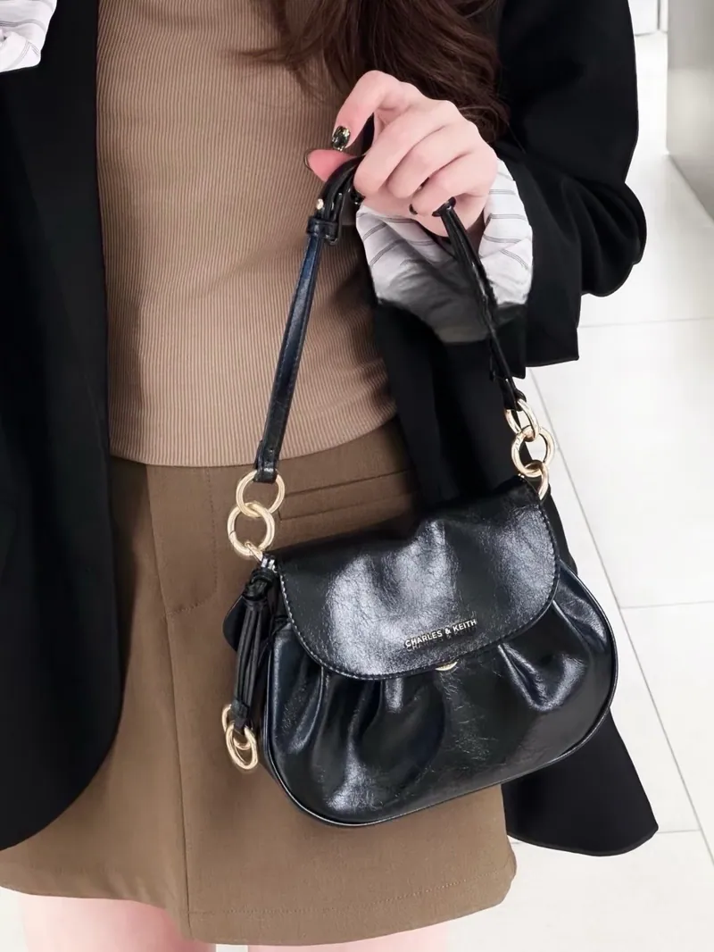 國外限定款 CHARLES & KEITH 小CK 褶皺 麂皮絨 馬鞍包