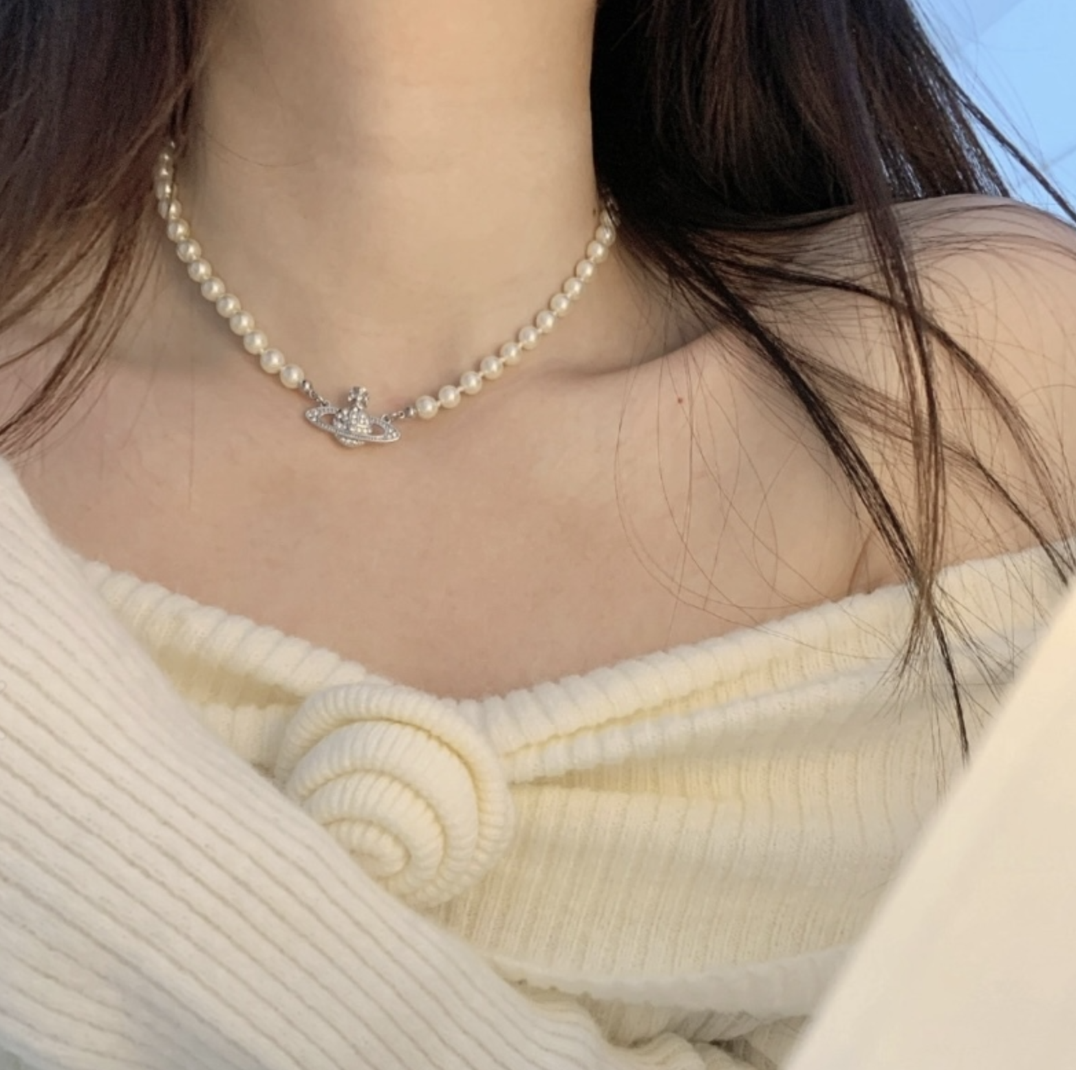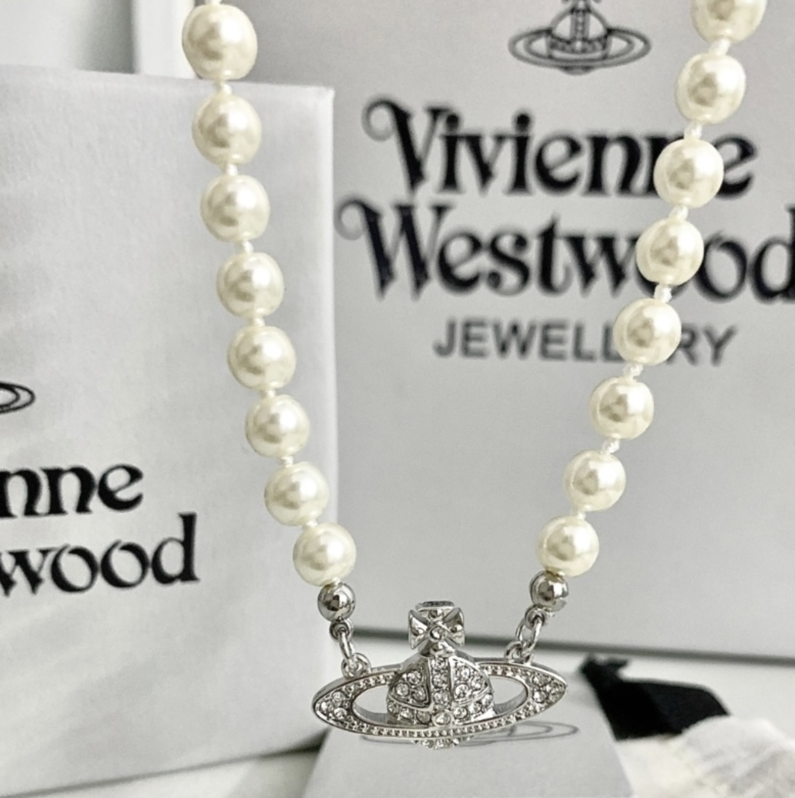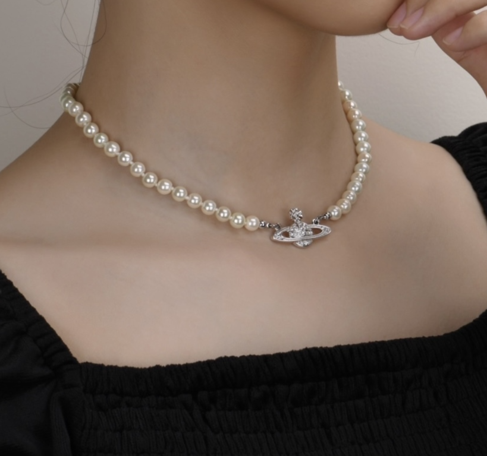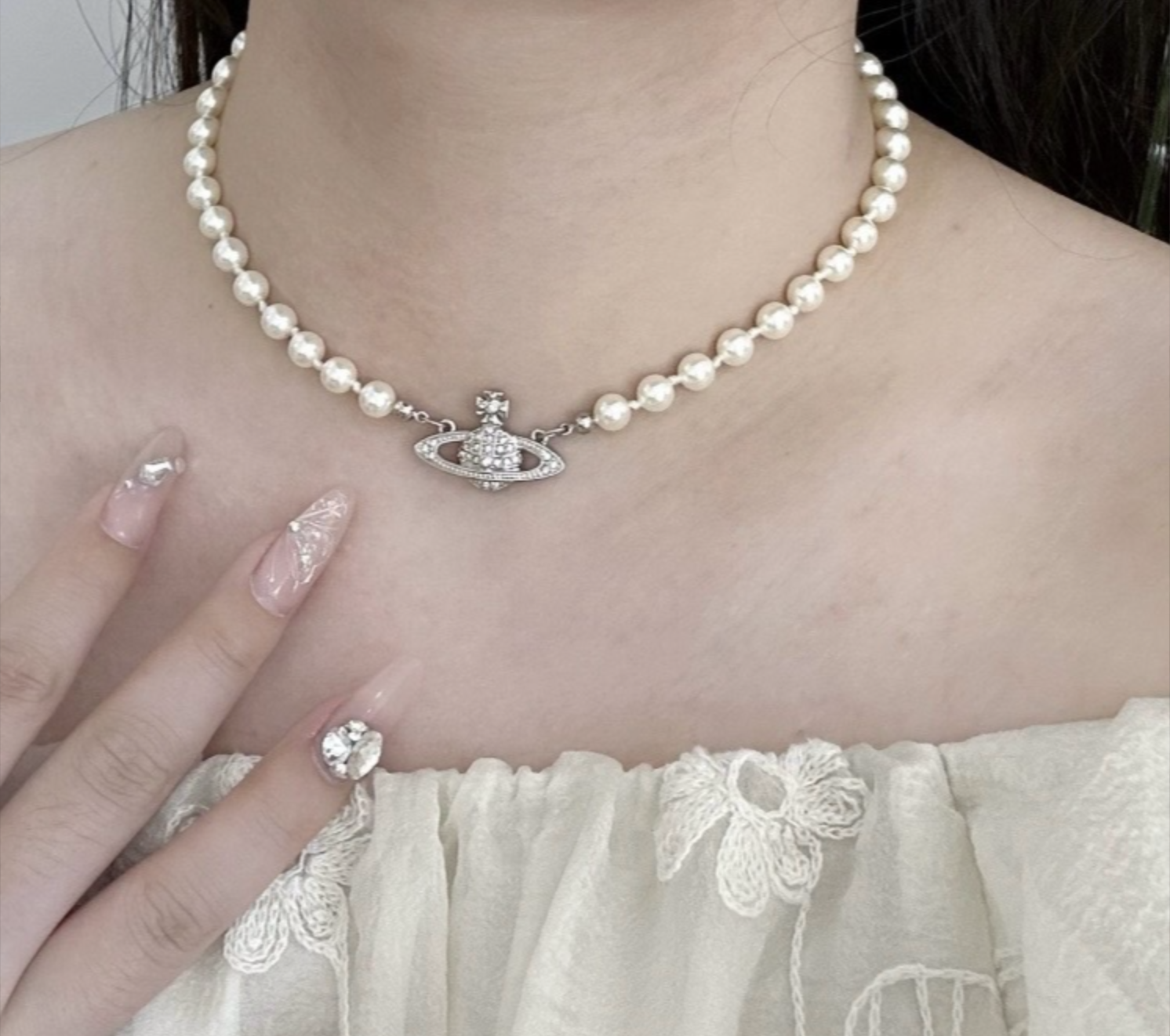VIVIENNE WESTWOOD經典款 浮雕土星 帶鑽Logo 珍珠 項鍊