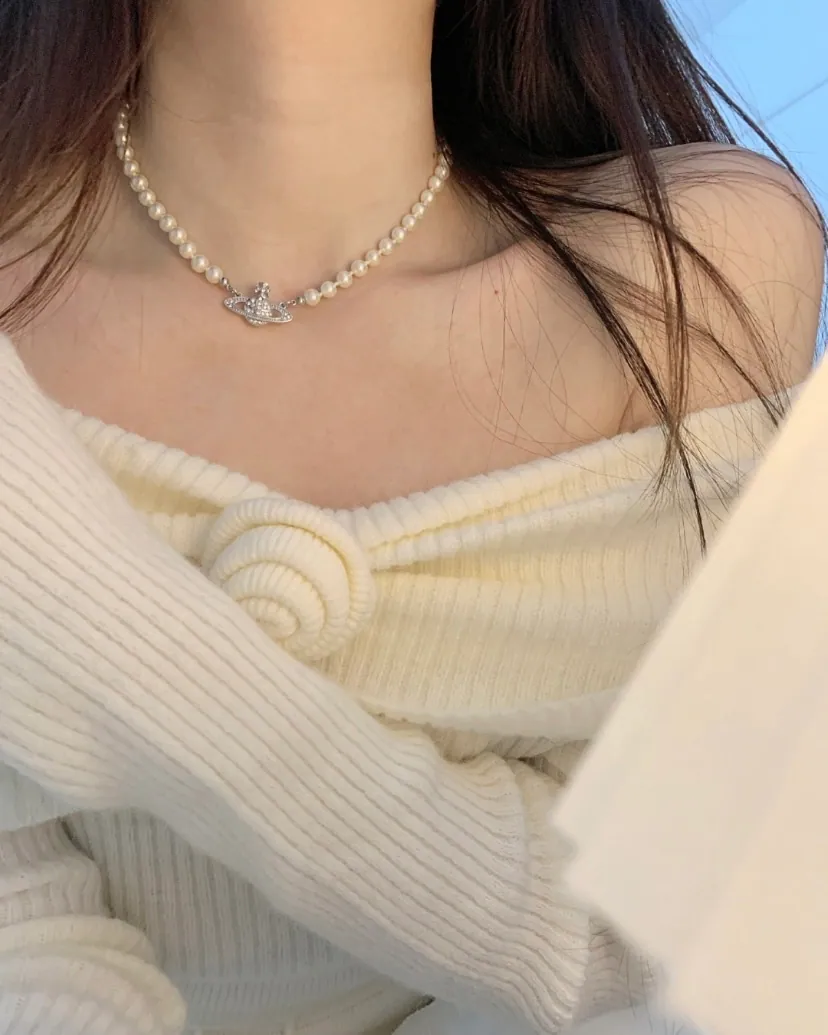 VIVIENNE WESTWOOD 西太后 MINI BAS RELIEFCHOKER 浮雕土星吊墜 銀 珍珠項鍊