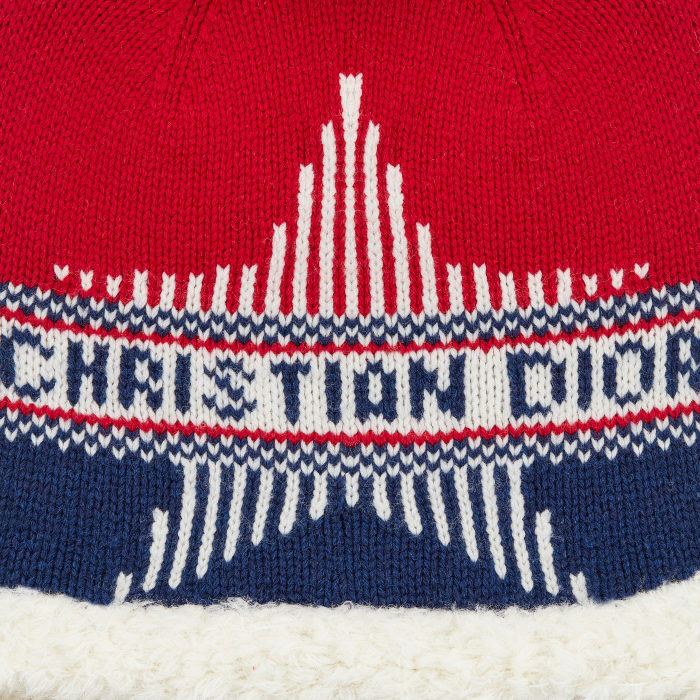 此款式以羊毛和羊絨嵌花織製作,綴以「CHRISTIAN DIOR」標誌飾帶和絨球。