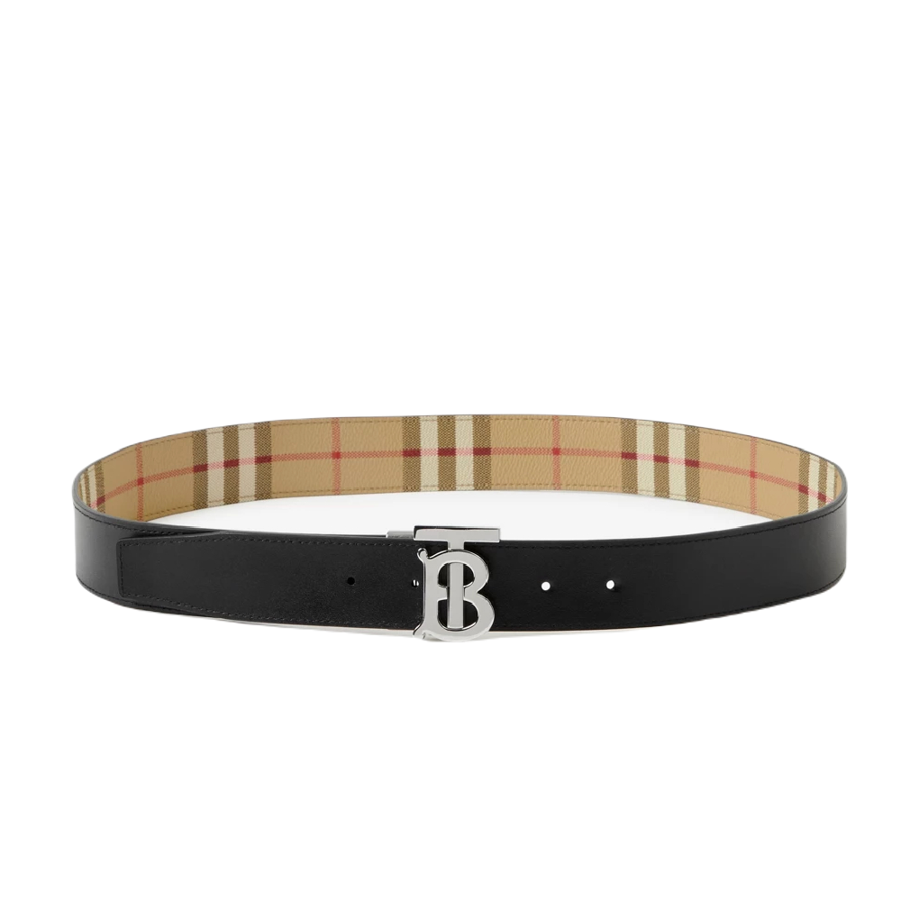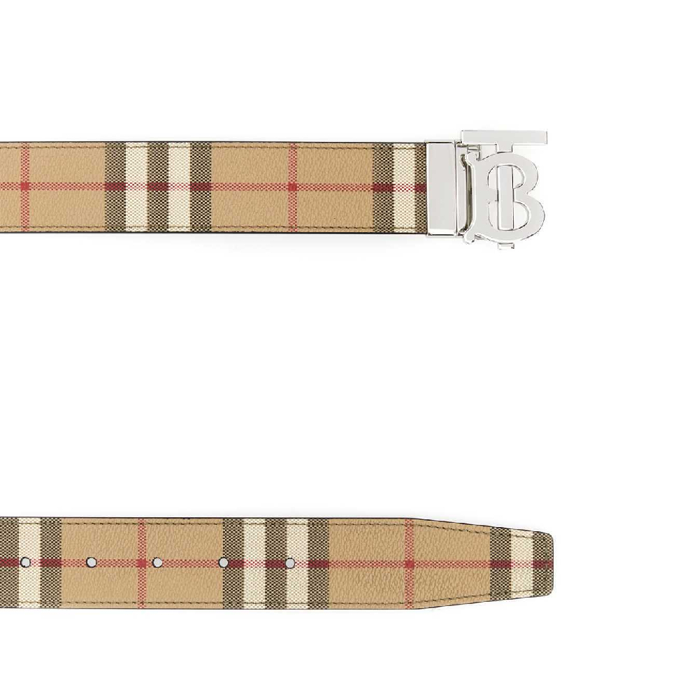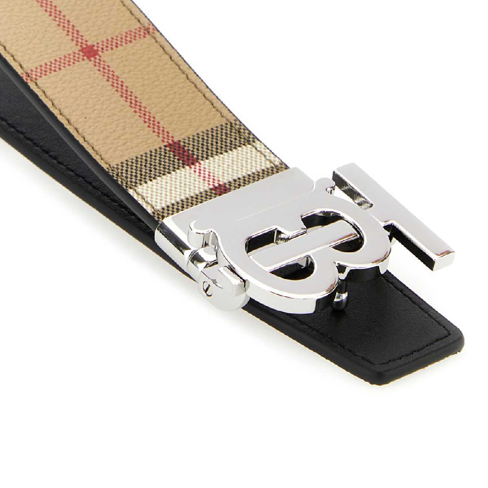 一面裝飾 Burberry 格紋,另一面採用光滑皮革材質打造,搭配 TB 專屬標誌造型的飾牌搭扣。
