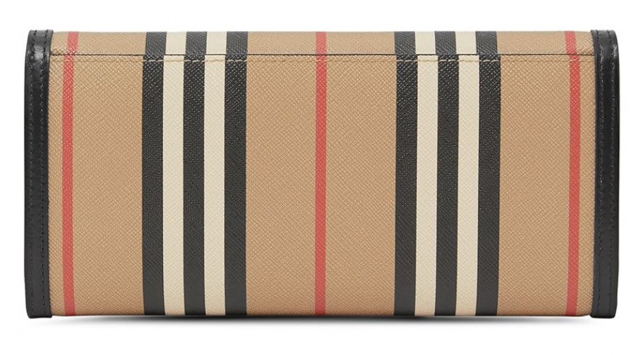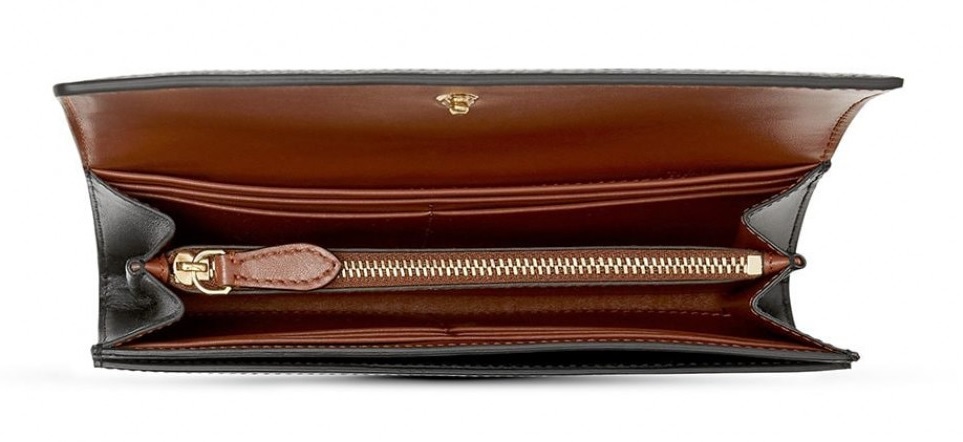 版型纖窄的長夾,飾有別致的標誌性條紋。皮夾內部採用光滑皮革,並設有多個卡片夾層。