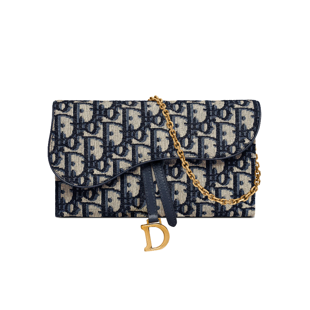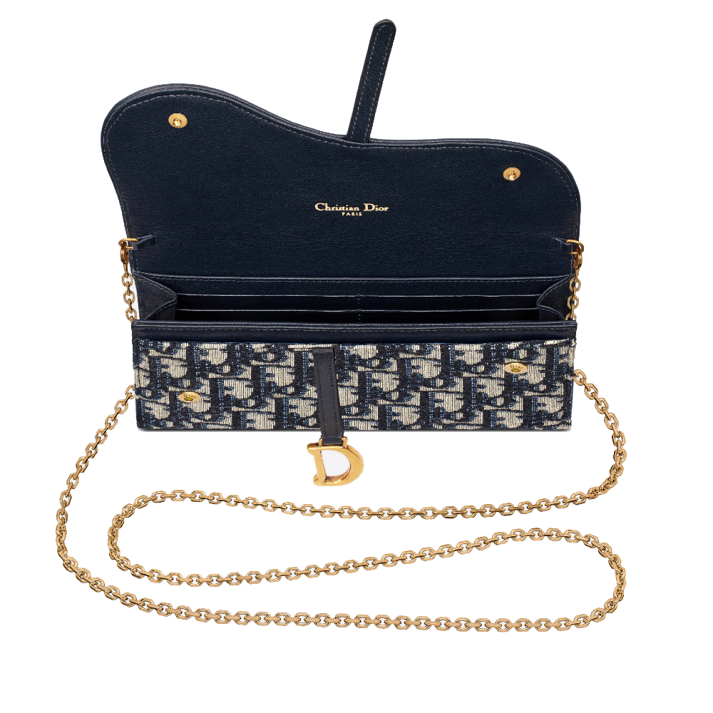 配有鏈帶的 Saddle 長型銀包以藍色 Dior Oblique 緹花製成,是設計時尚簡約的混搭精品。