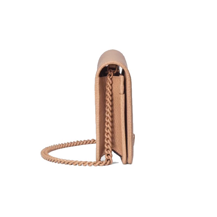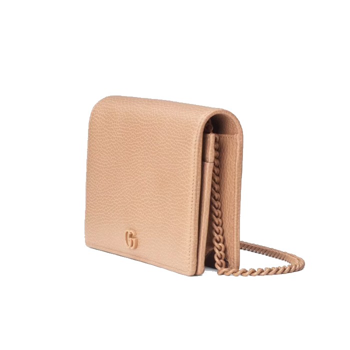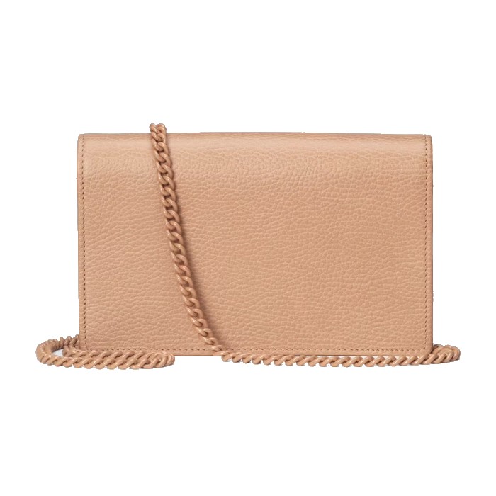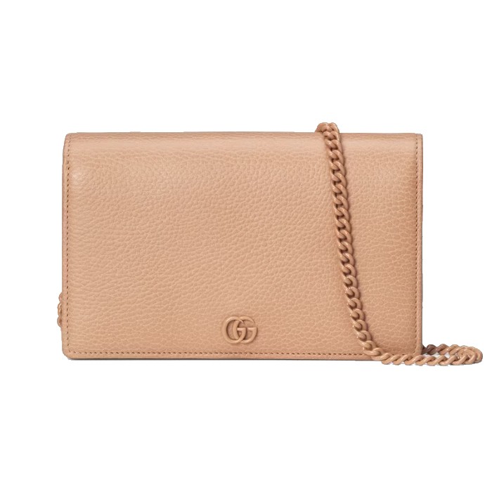 這款GG Marmont鏈帶銀包在Aria系列中推出,並採用了柔和的玫瑰米色皮革製作。