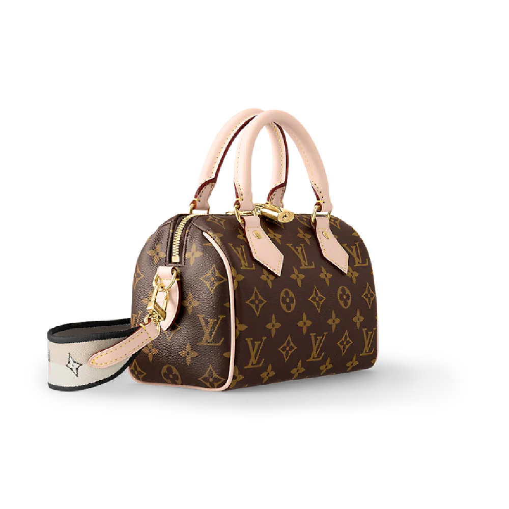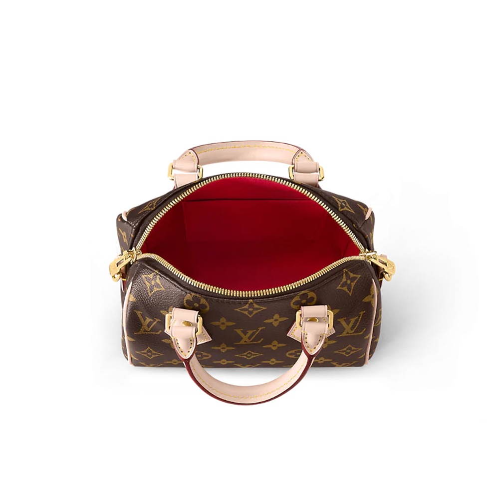 這款Speedy Bandoulière 20包款以迷你造型演繹路易威登經典Speedy旅行袋,設計以Monogram帆布製造,並綴以天然牛皮飾邊。包款配上卷邊皮革的頂部手柄,可拆式及可調節紡織肩帶綴有Louis Vuitton編織標誌,紅色紡織面料襯裡盡顯經典風格的設計。